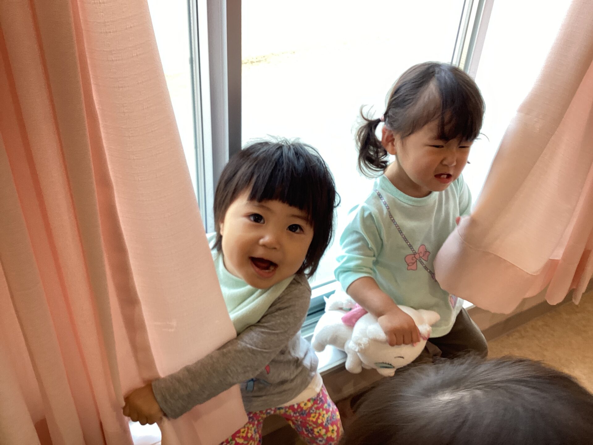 スカーフやカーテン、バスの中に入っては「ばぁ~!!」と可愛らしい笑顔を見せます。