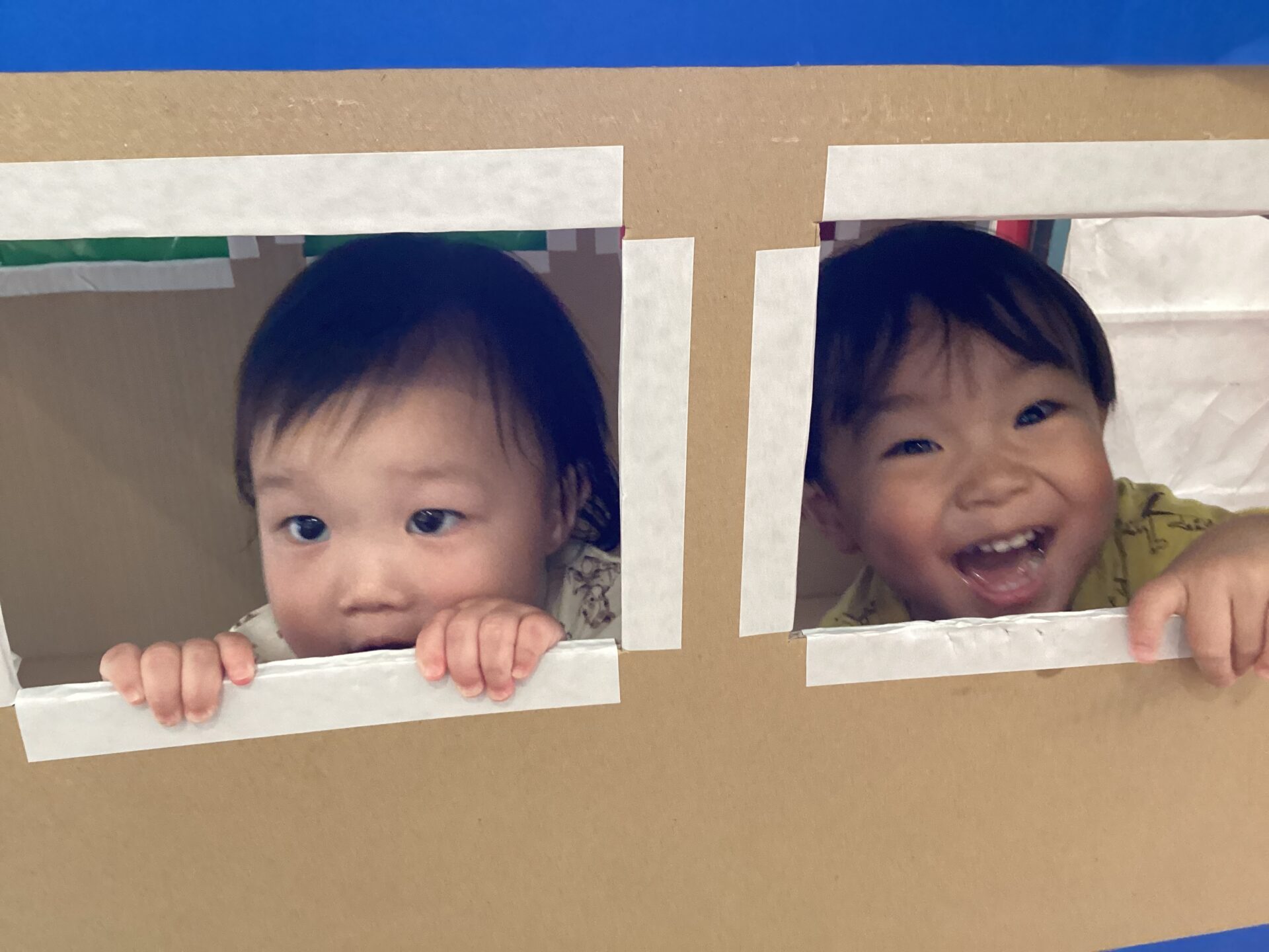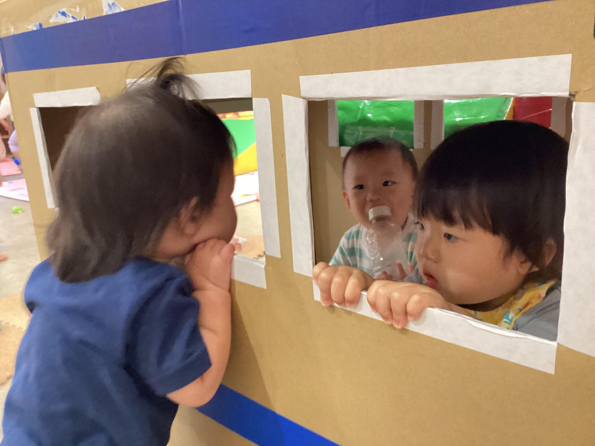 友達と顔を合わせて、バスのトンネルの窓から「ばぁ~!!」