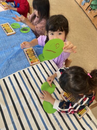 3歳児 にじチーム 制作 「おばけのまめを作りました♪」