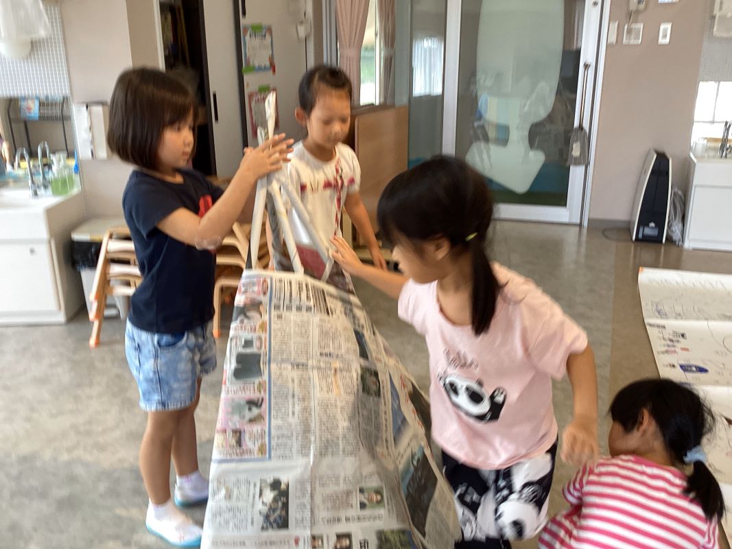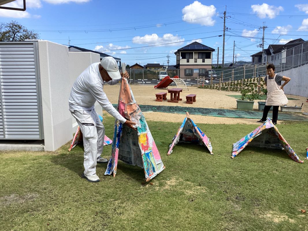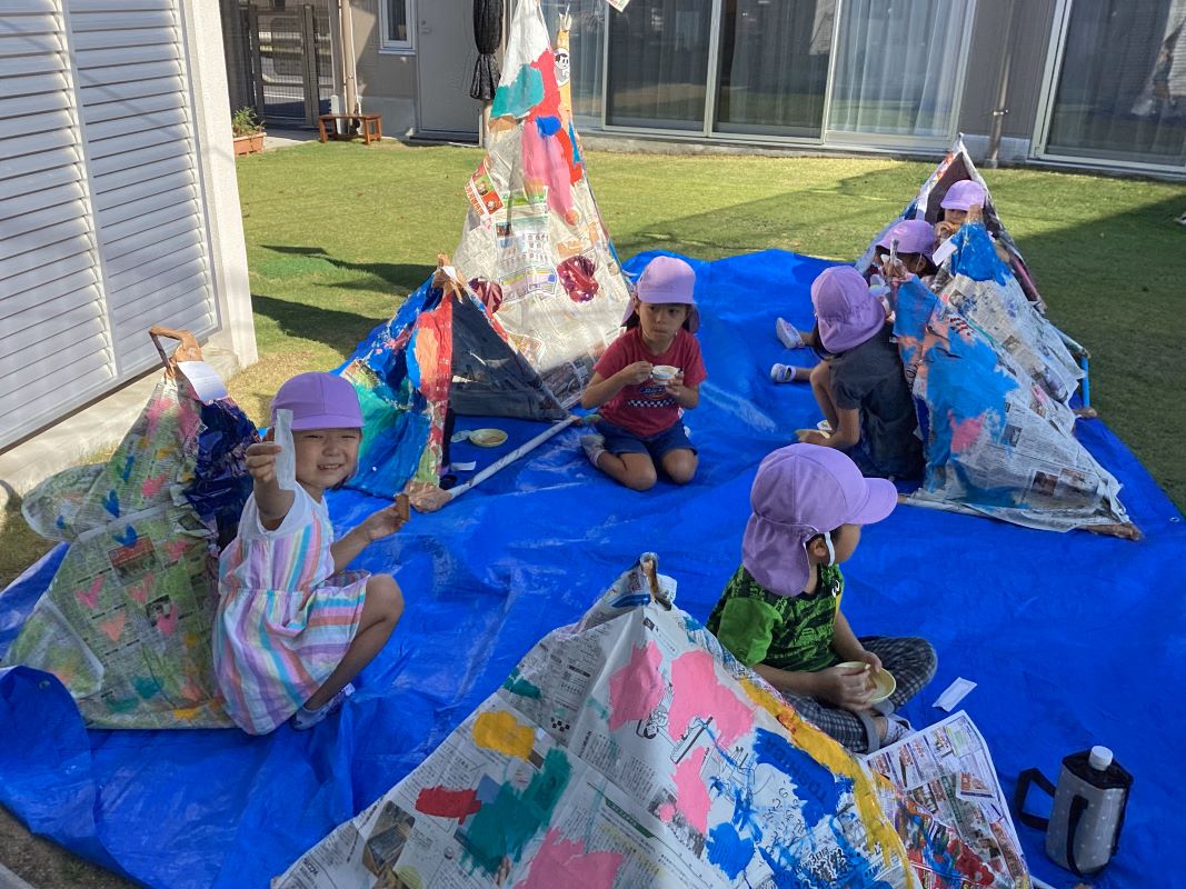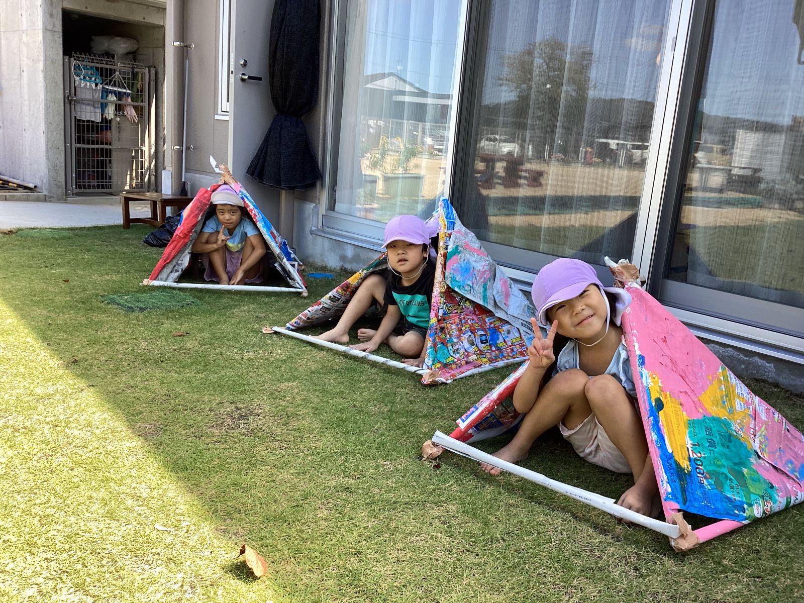 固くて頑丈な新聞紙の棒を作って、テントを完成させた子ども達。
