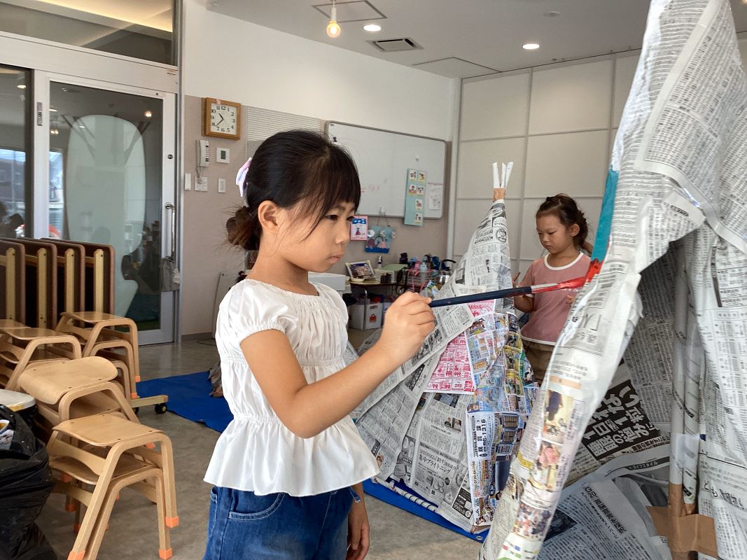 その後、新聞紙の棒を骨組みにしながら組み立て、