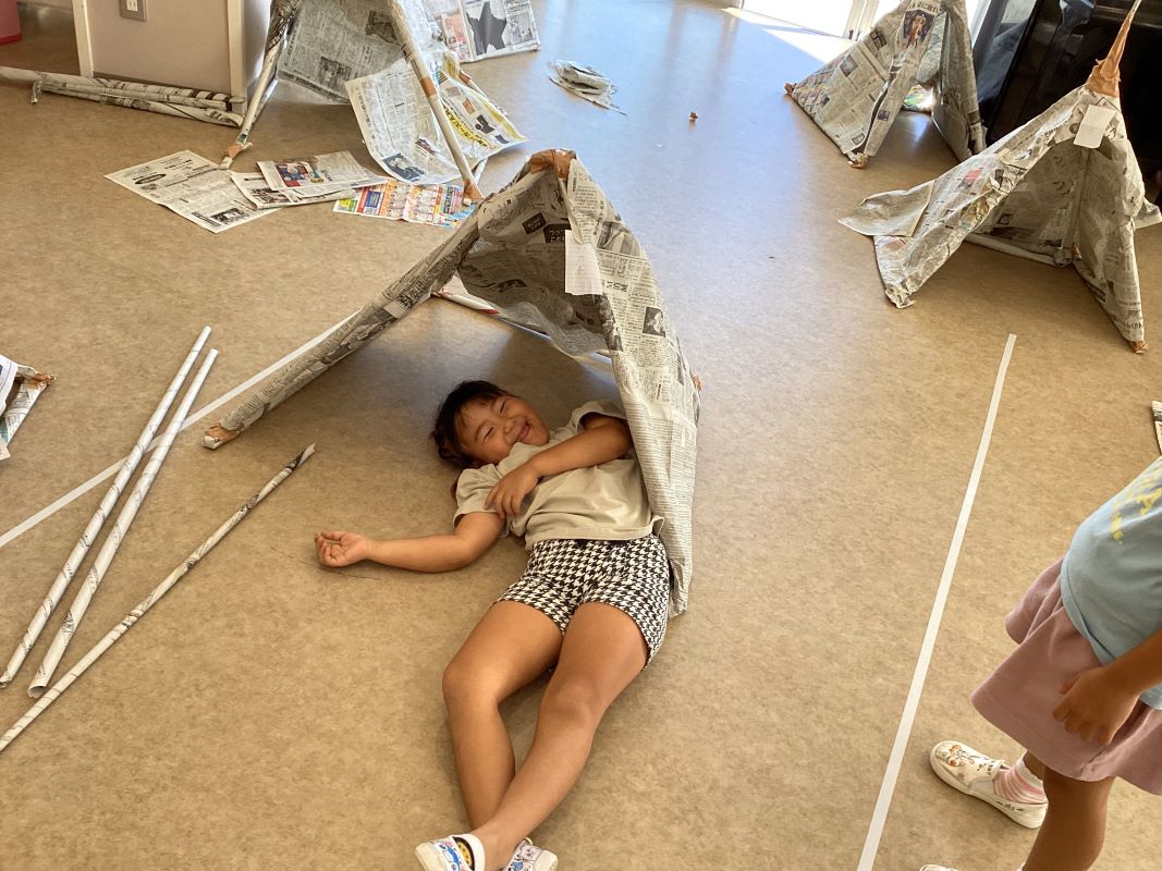 固くて頑丈な新聞紙の棒を作って、テントを完成させた子ども達。