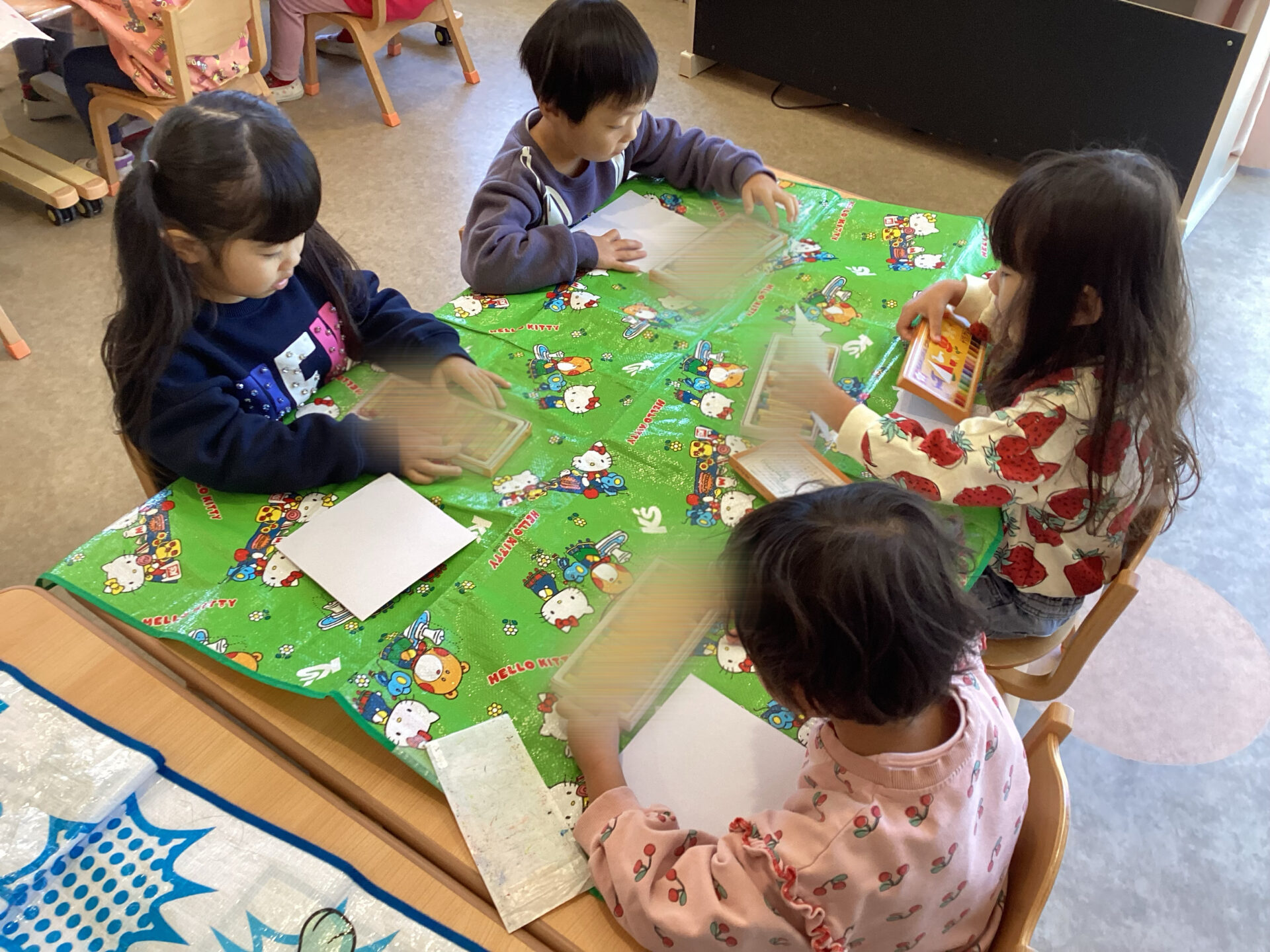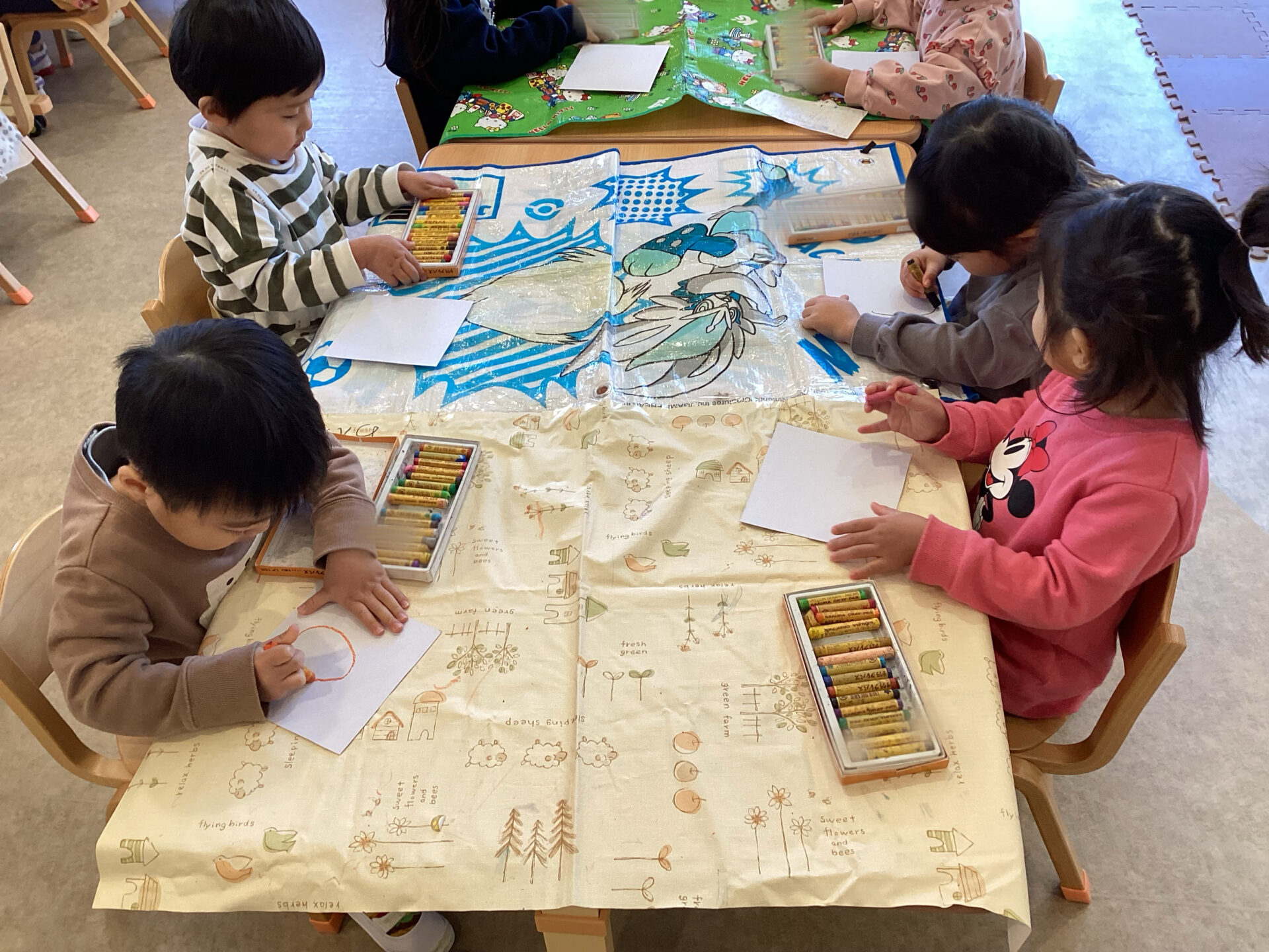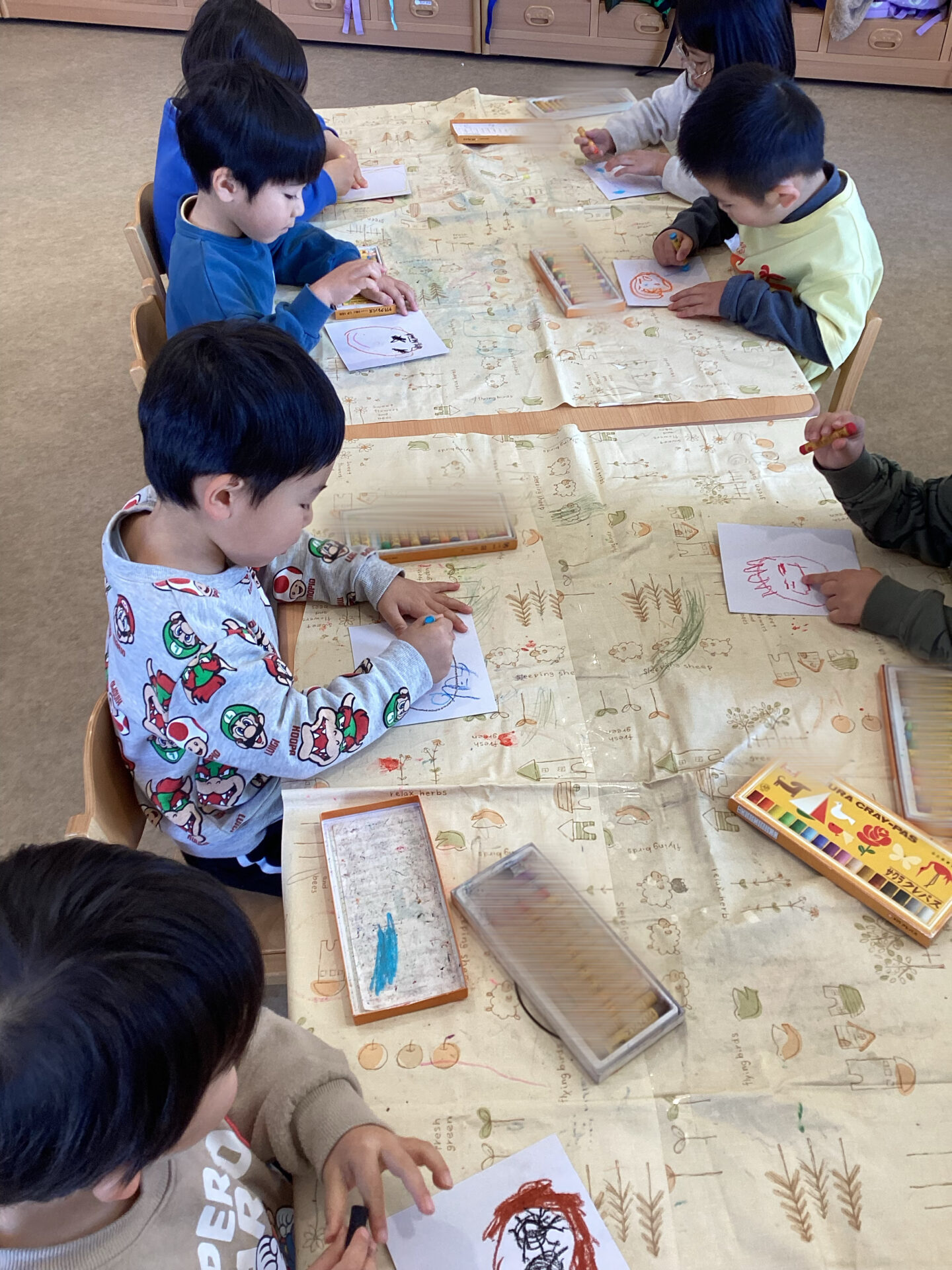 今までは、好きなキャラクターや身近な食材や乗り物を描くことが多かったのですが、今回顔を描くことは子ども達にとって、新鮮な気持ちだったと感じます。また、友達を意識したり興味をもつことが増えたので、友達と一緒に描くことも子ども達にとっては良い刺激になったと思います。