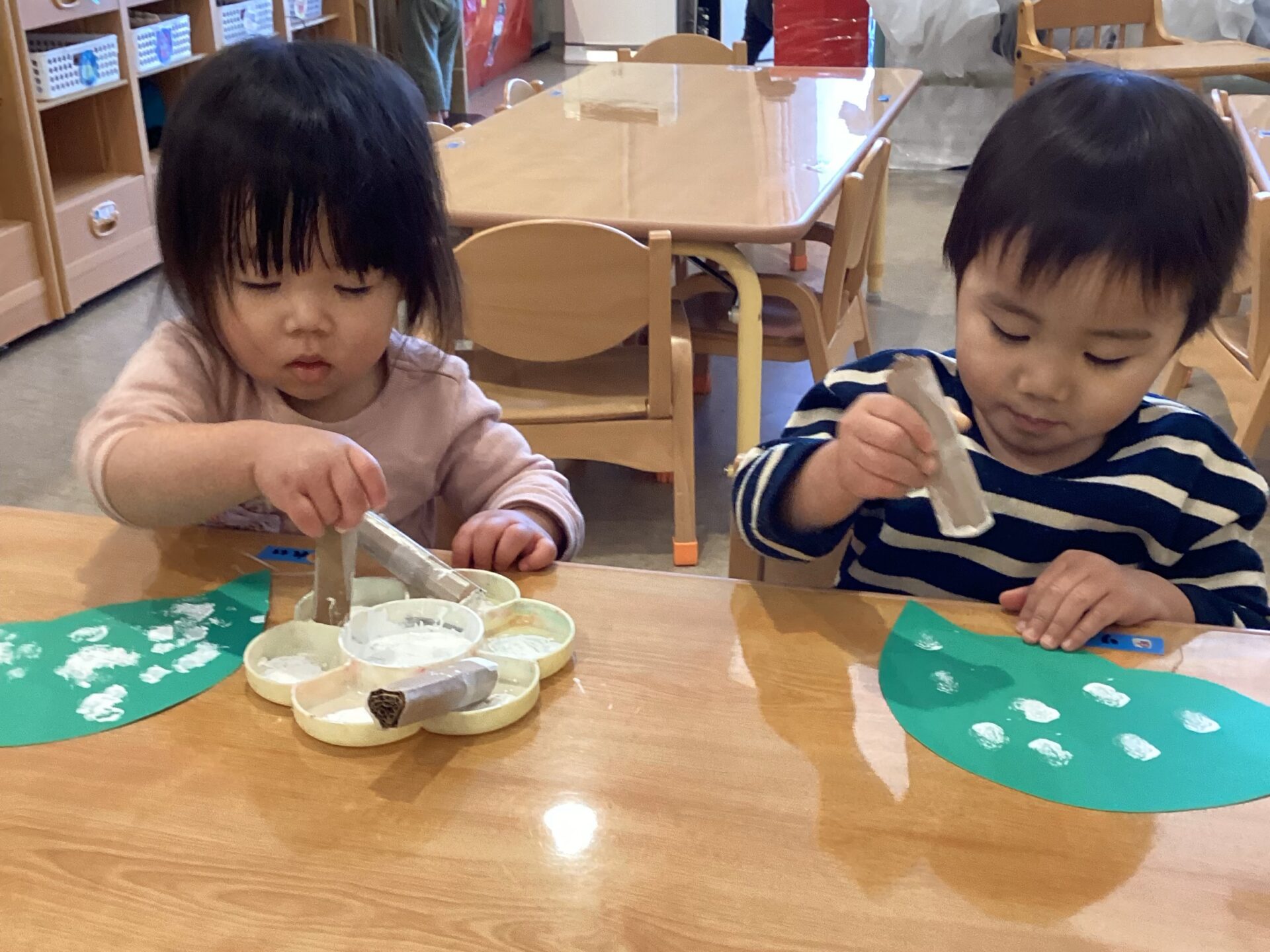 小さな手で、ぎゅっと握りしめてスタンプを持つ子ども達。