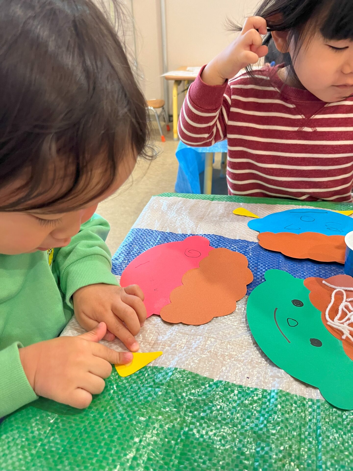 顔を描いた後に糊を使って、角を貼りました。