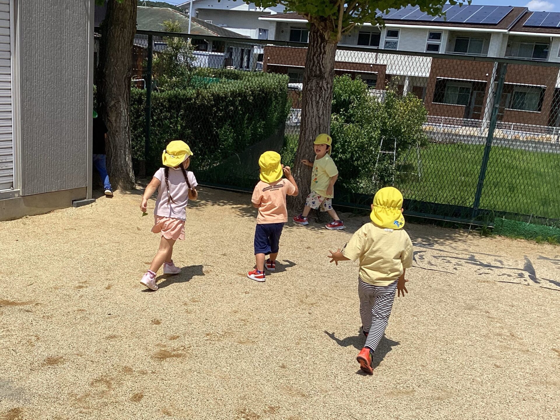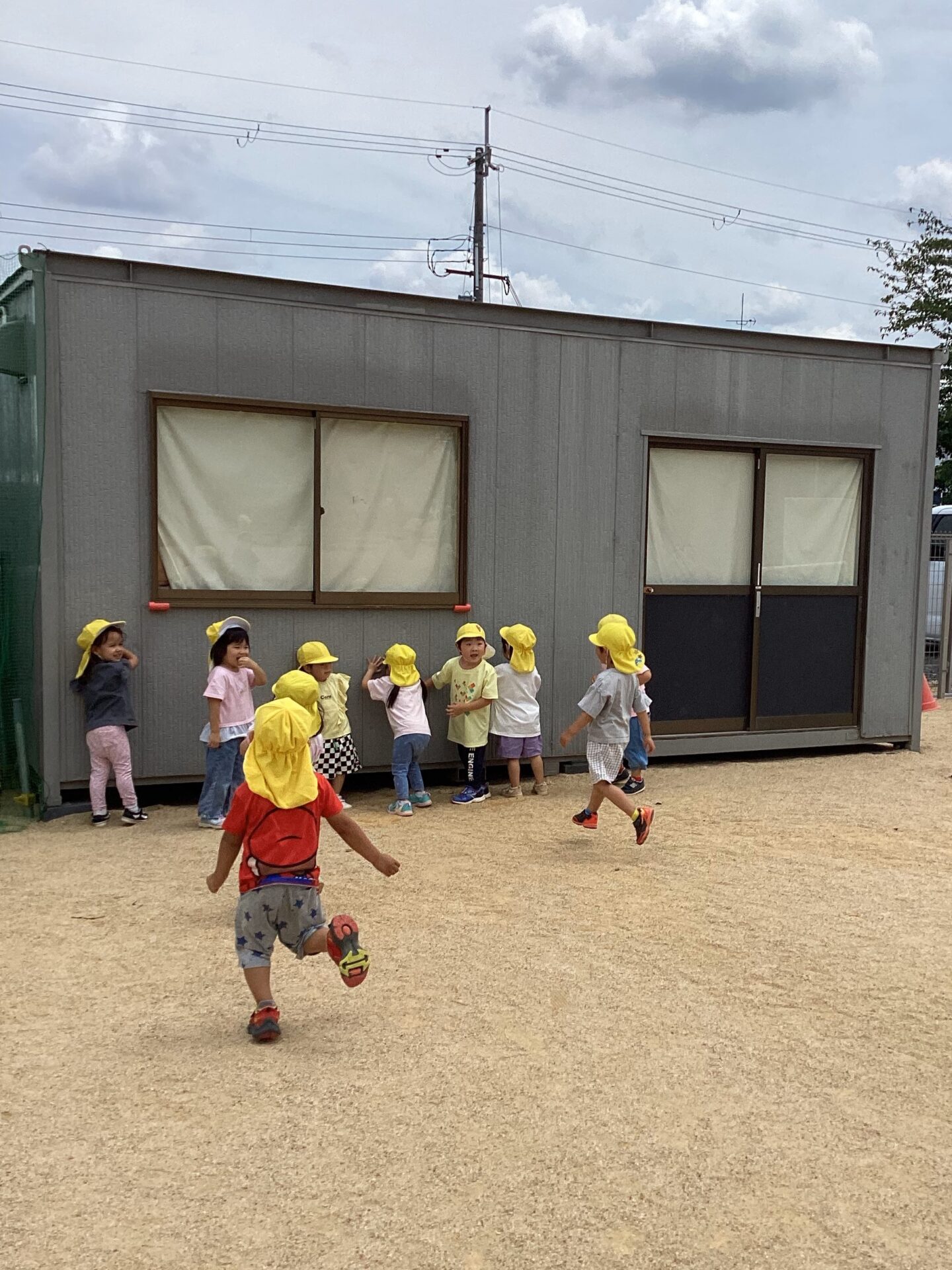 と、子ども達は、再び 楽しんでいました。 今度は、鬼にタッチした後の、ルールをつけ加えたり、 「だるまさんは〇〇」と動きを指示したりして、アレンジを加えながら、