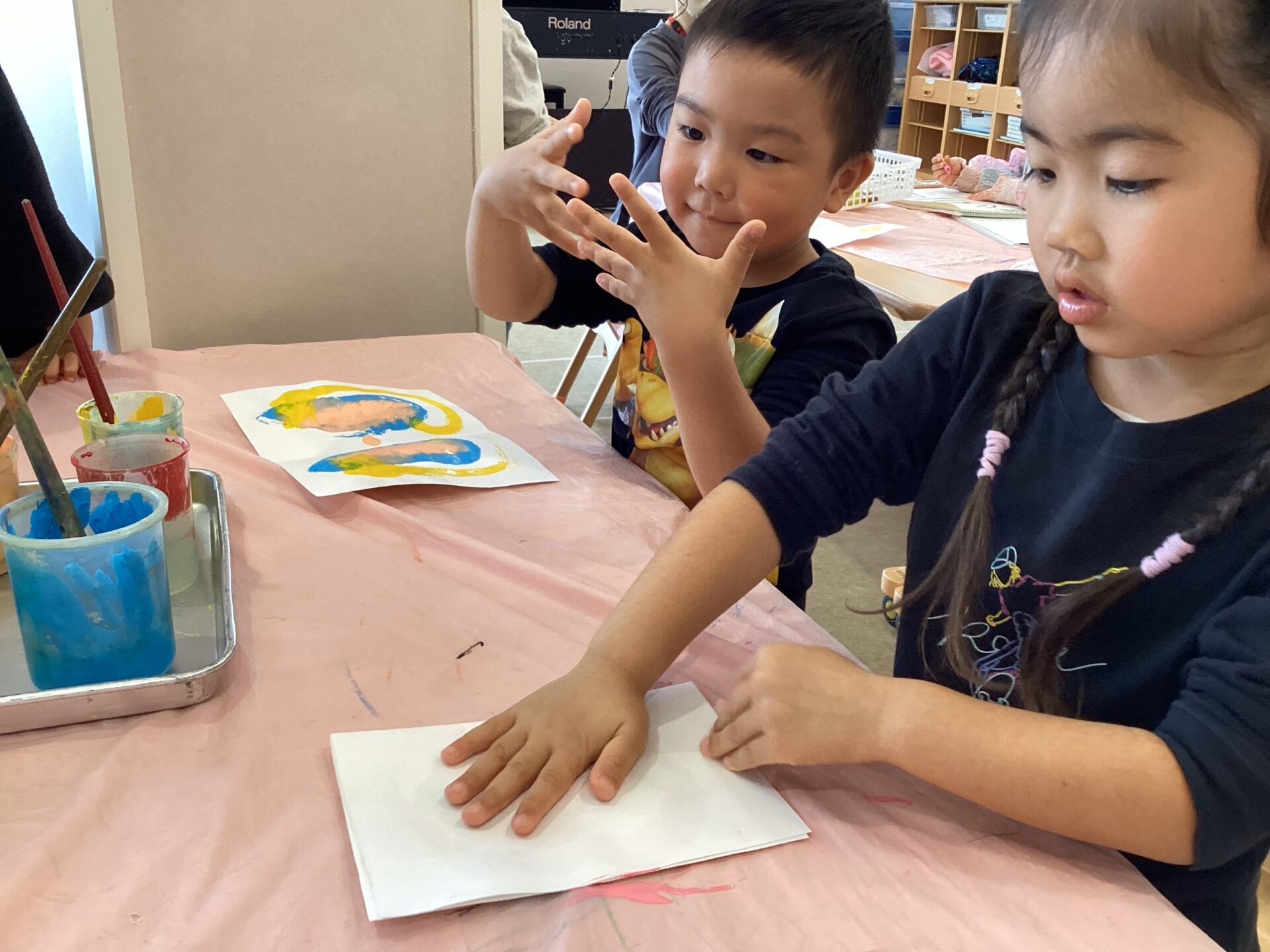 「葉っぱみたいな形ができた」「色が混ざって新しい色ができた」など