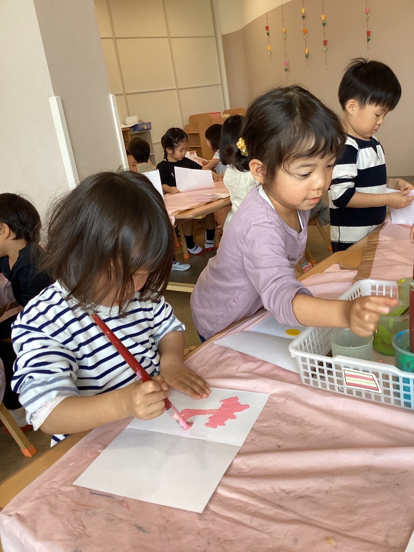 出来た作品は、ちょうちょの形に切って保育室に飾りたいと思います。