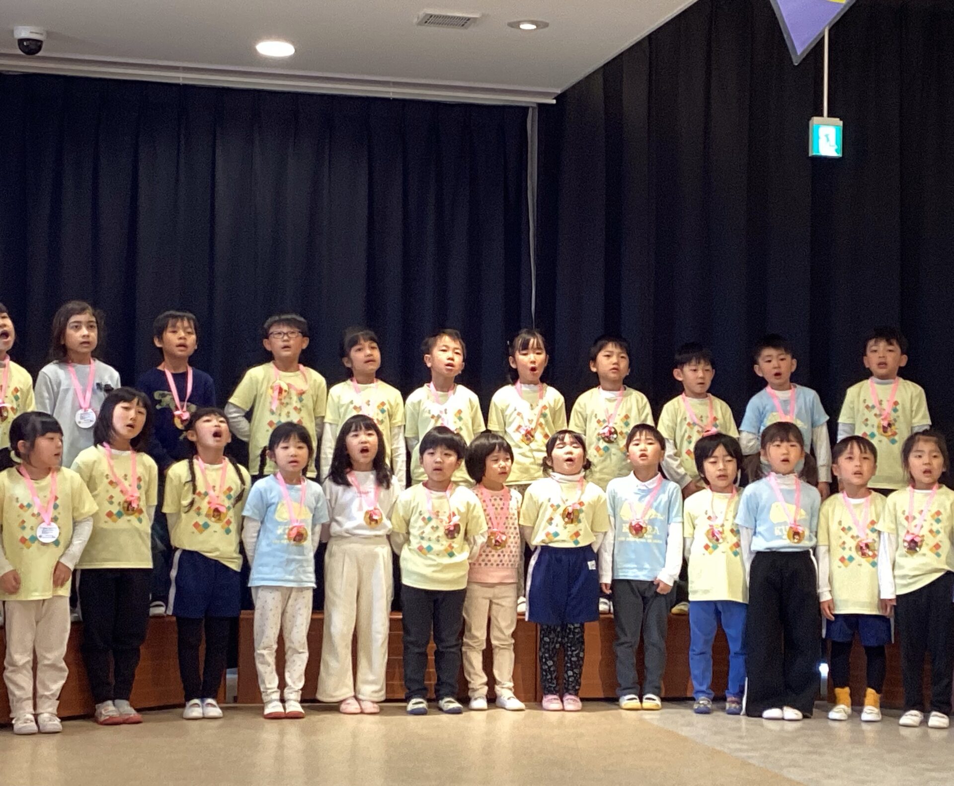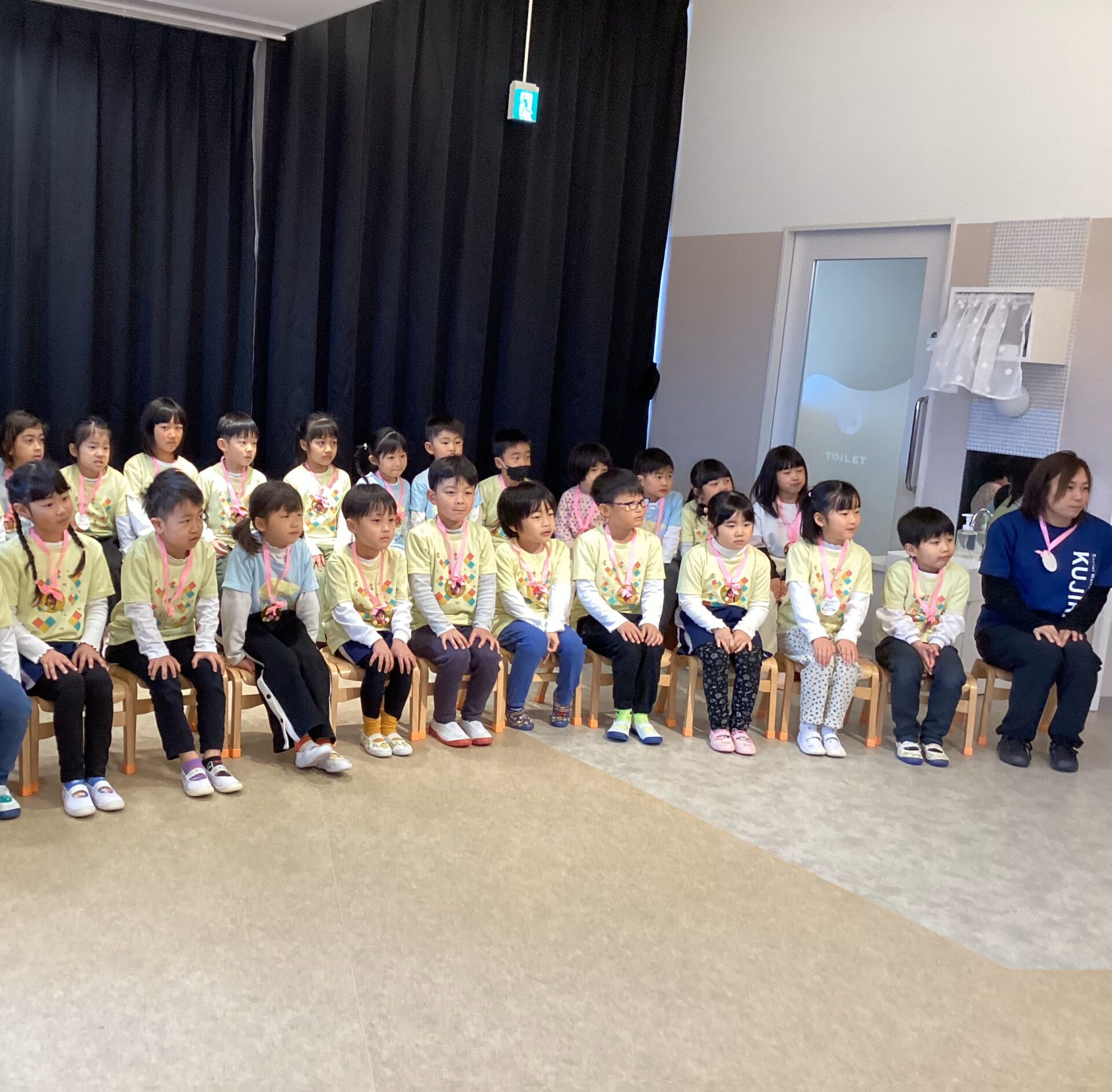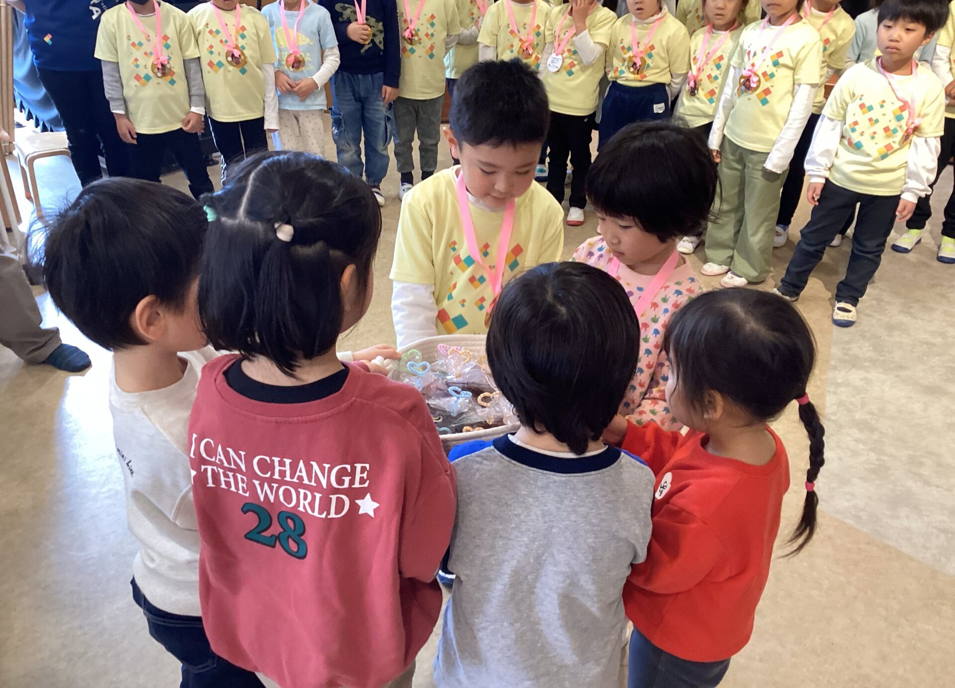 お別れ会当日。 「ドキドキドン!一年生」の曲で入場してきた年長児を、大きな拍手で迎えました。 0歳児うみチームからもらった可愛いメダルを首にかけ、照れくさそうな表情の子ども達でした。