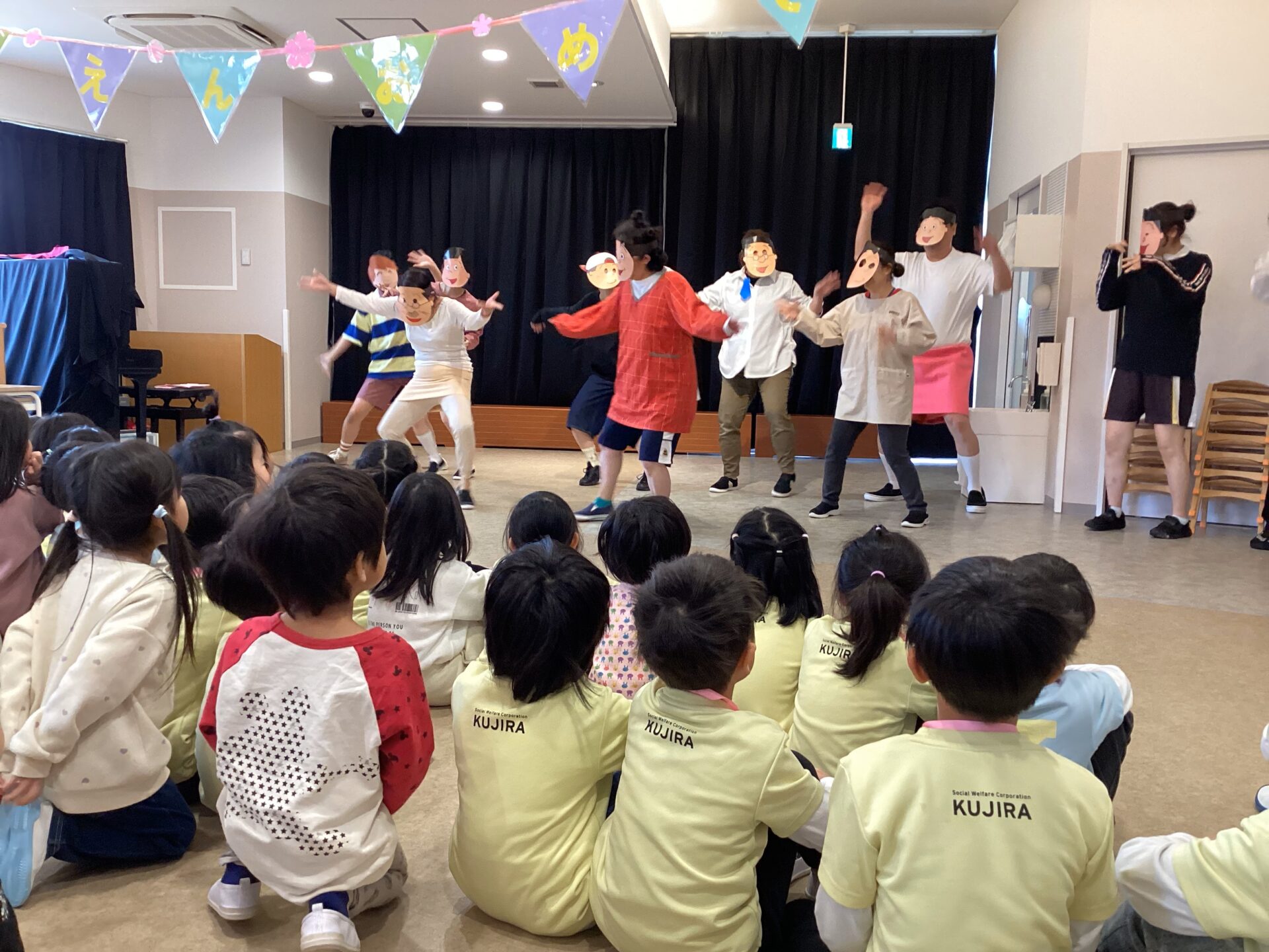 次は、職員からのプレゼント。 サザエさんやセーラームーンが登場し、会場は大盛り上がりでした。 知らない子ども達も多かったですが、先生達が変装して踊る姿に大興奮でした。