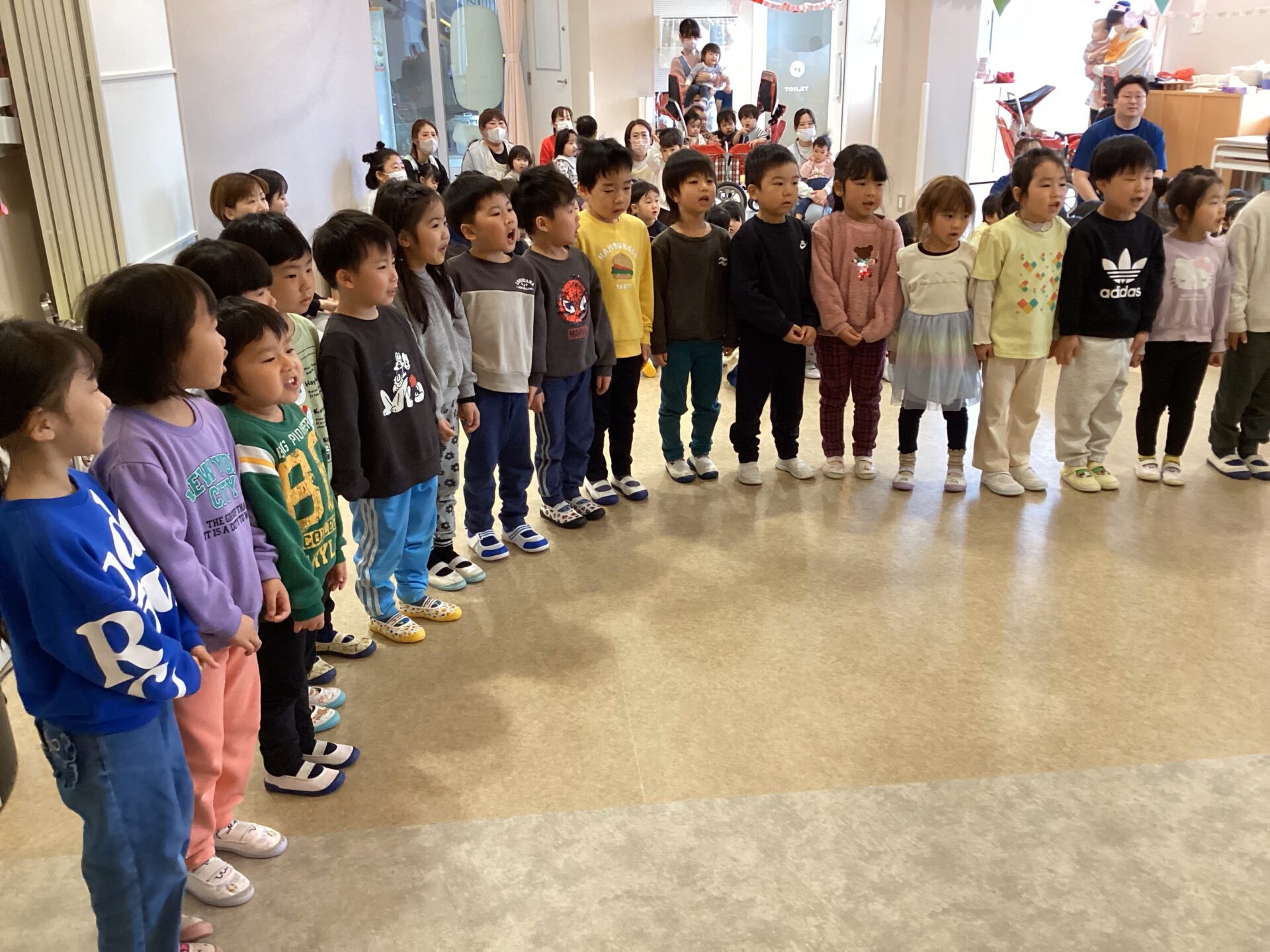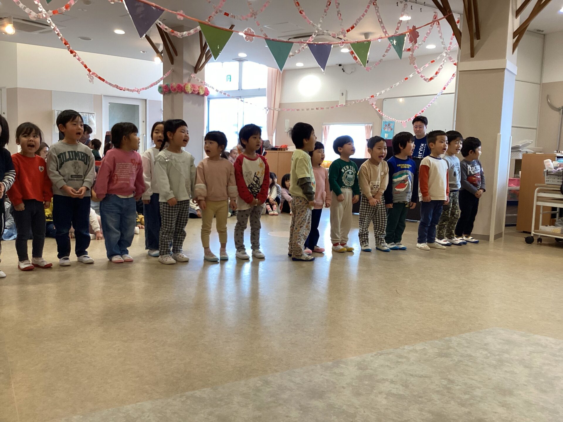 まず初めは、各クラスから歌や踊りのプレゼントを贈りました。 年長児の子ども達も一緒に歌ったり、踊ったりする姿を見て、あたたかい気持ちになりました。