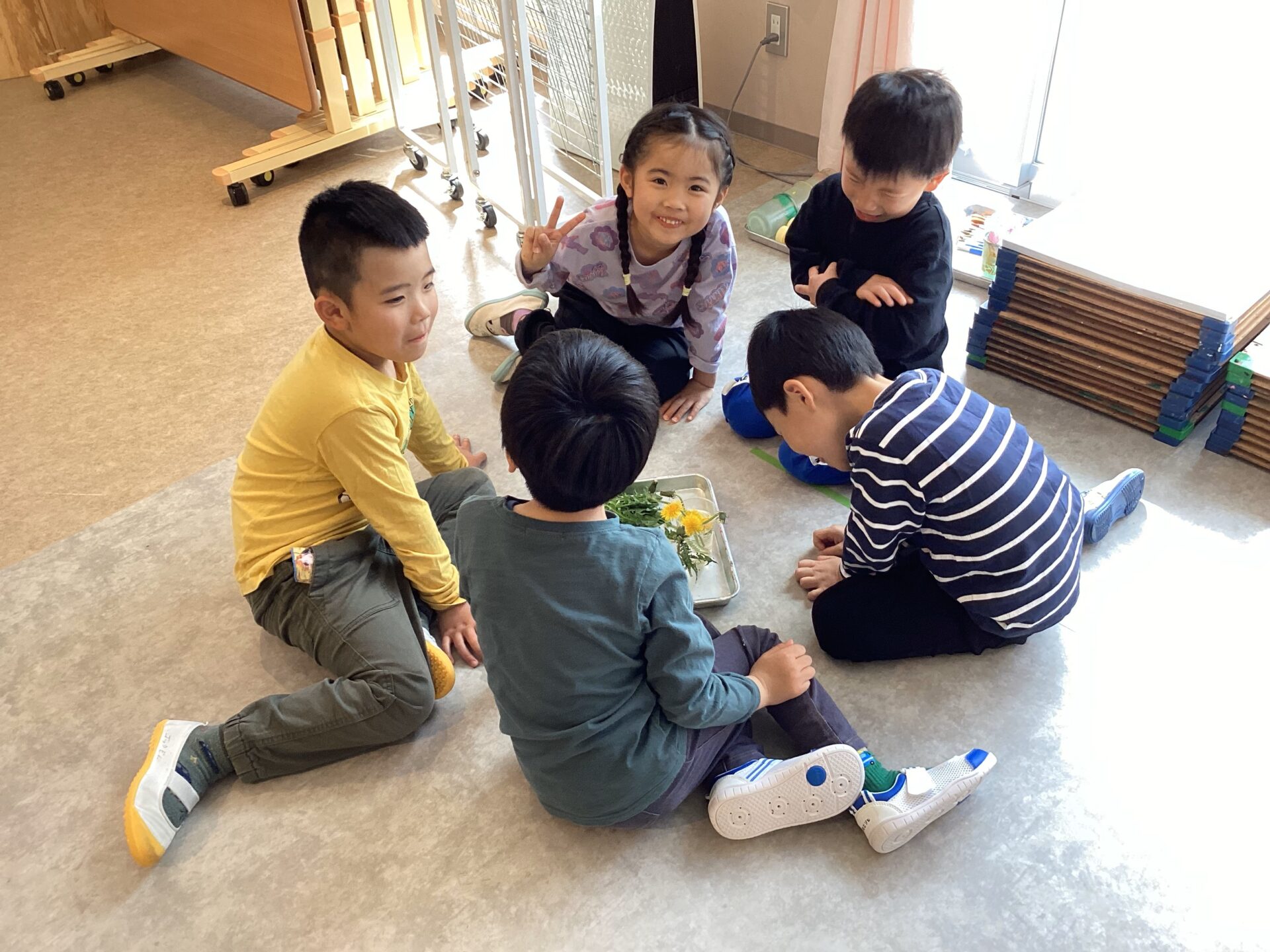 保育士等が「タンポポのお花の部分は、花びらじゃなくて、小さなお花が集まって大きなお花みたいに見えるんだよ」と伝えると、より興味を示し不思議そうに観察をしていました。