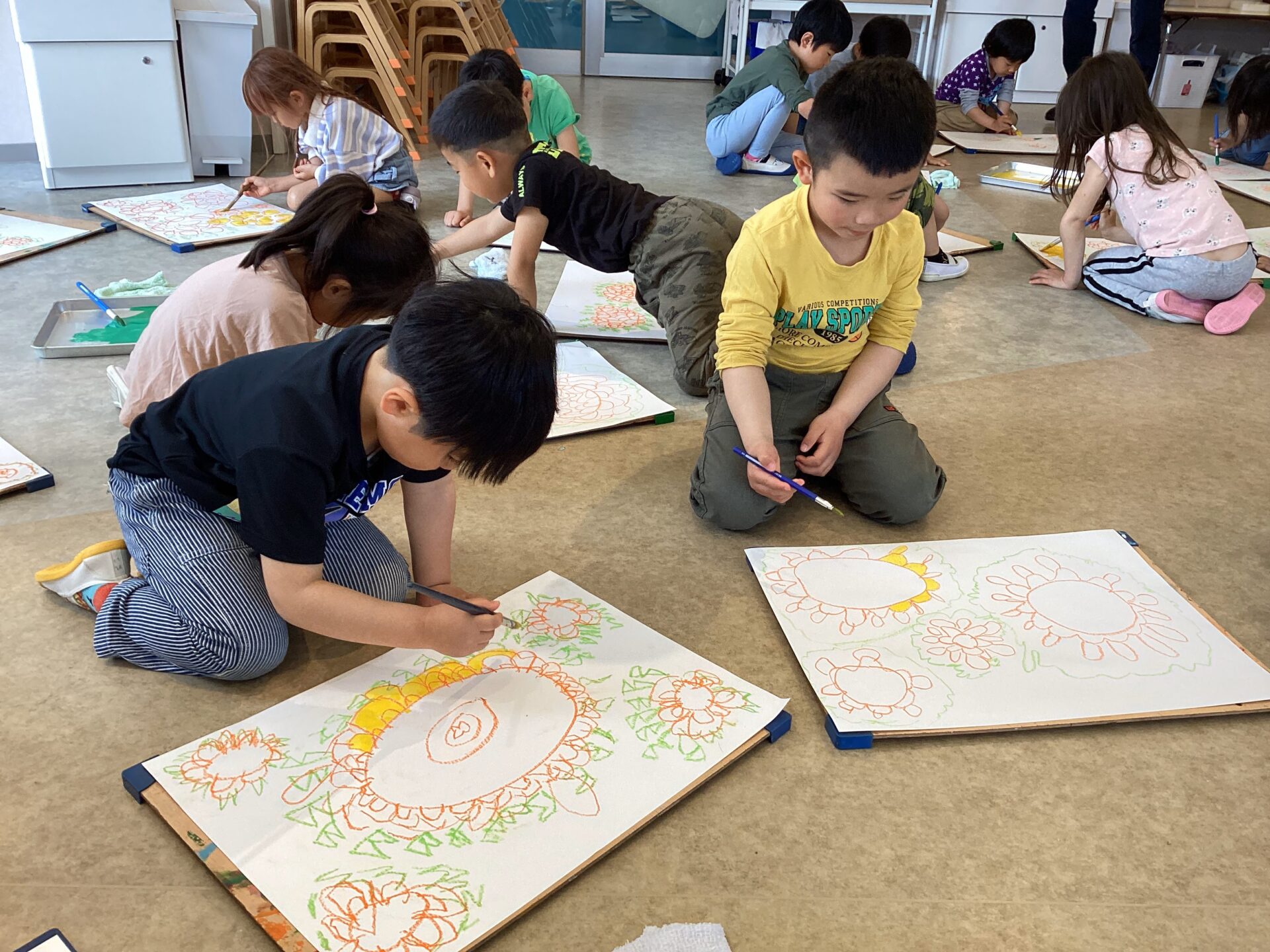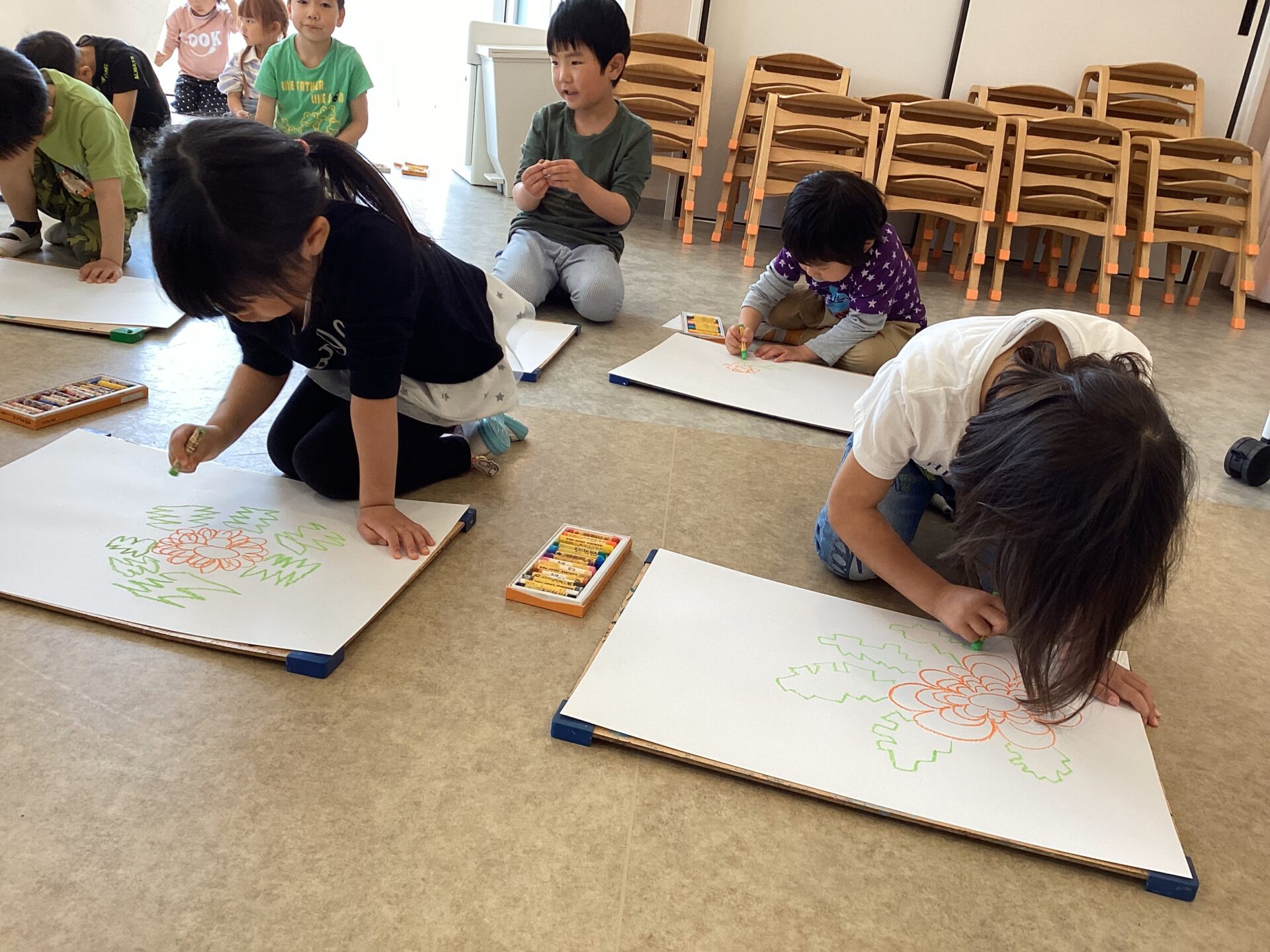 まず初めに、クレパスを使ってお花と葉っぱを描きました。 白い画用紙いっぱいに大きく描く子どももいれば、小さなタンポポをたくさん描く子どももいました。