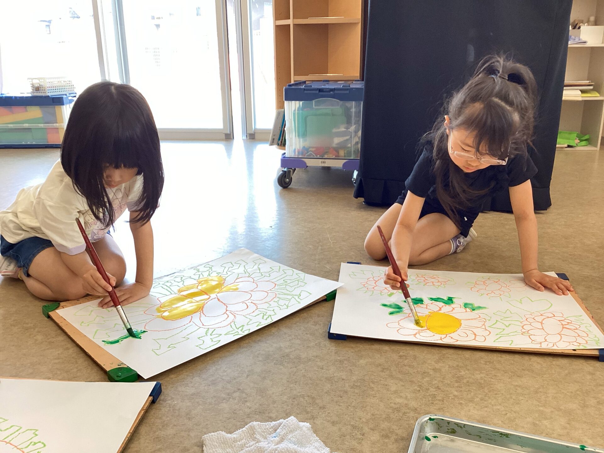 そのあと、絵の具で色を塗りました。 線からはみ出ないように、丁寧に塗り進めたり、絵の具がクレパスをはじく様子に驚いていた子ども達でした。