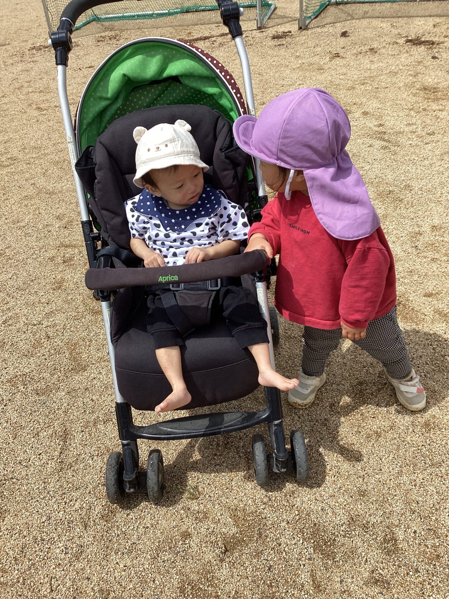 天気の良い日が続き、初めてベビーカーに乗って、園庭を散歩。