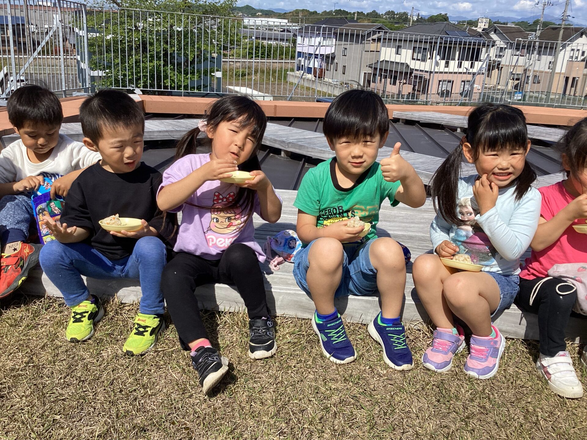ぽかぽか天気の良い日に、そらチームのみんなで屋上へ行き、午後のおやつを食べました。