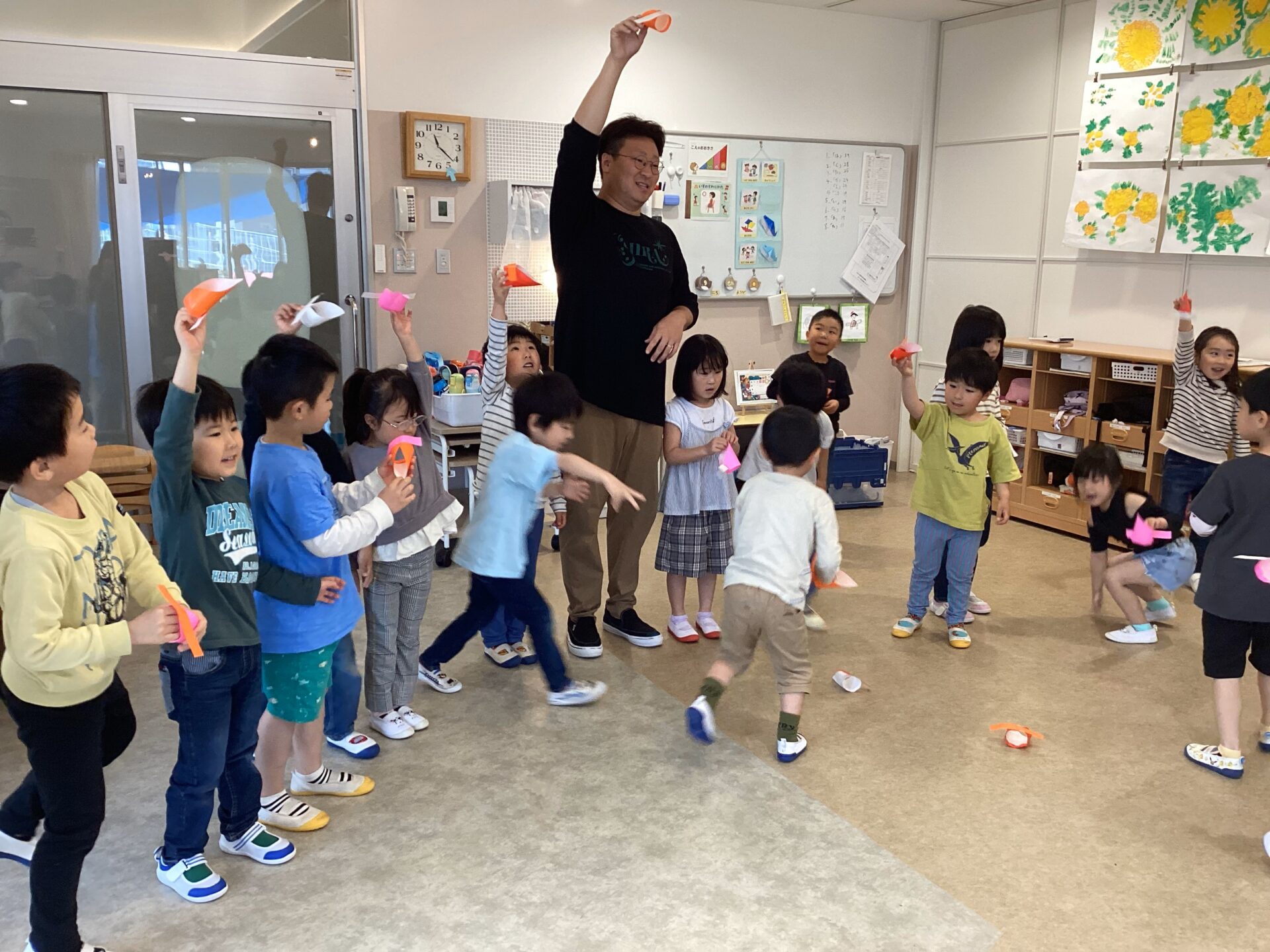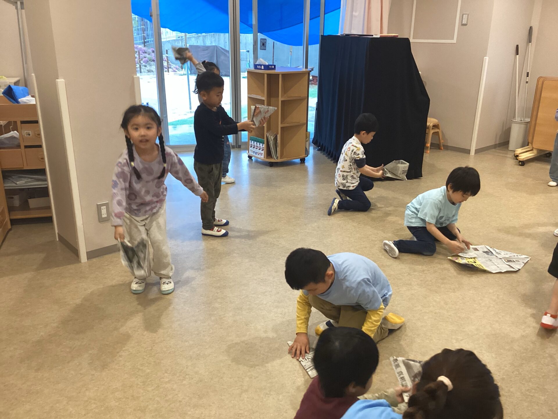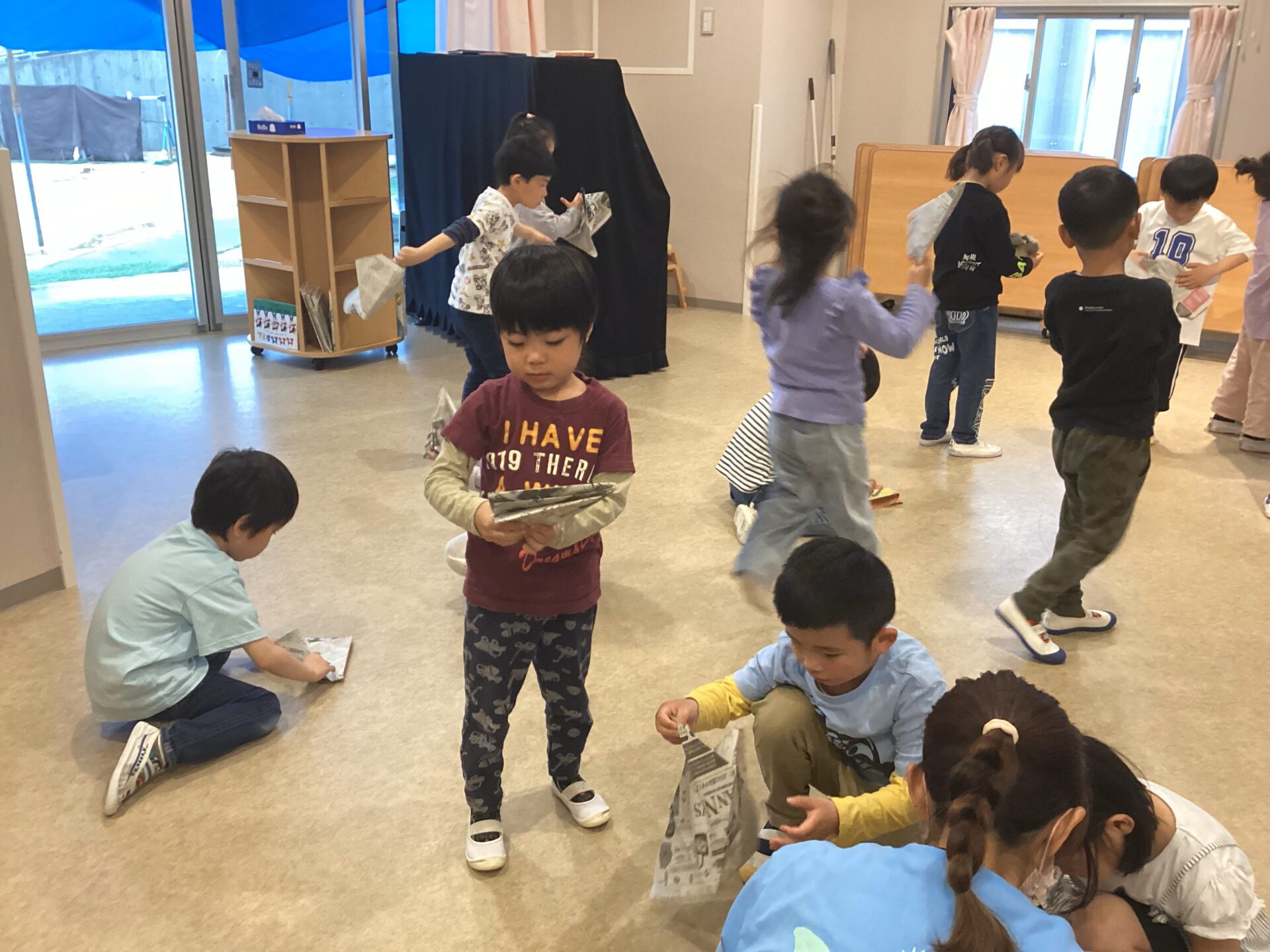 くじらチームでは、最近自分達で折り紙や新聞紙を使って、遊んでいます。