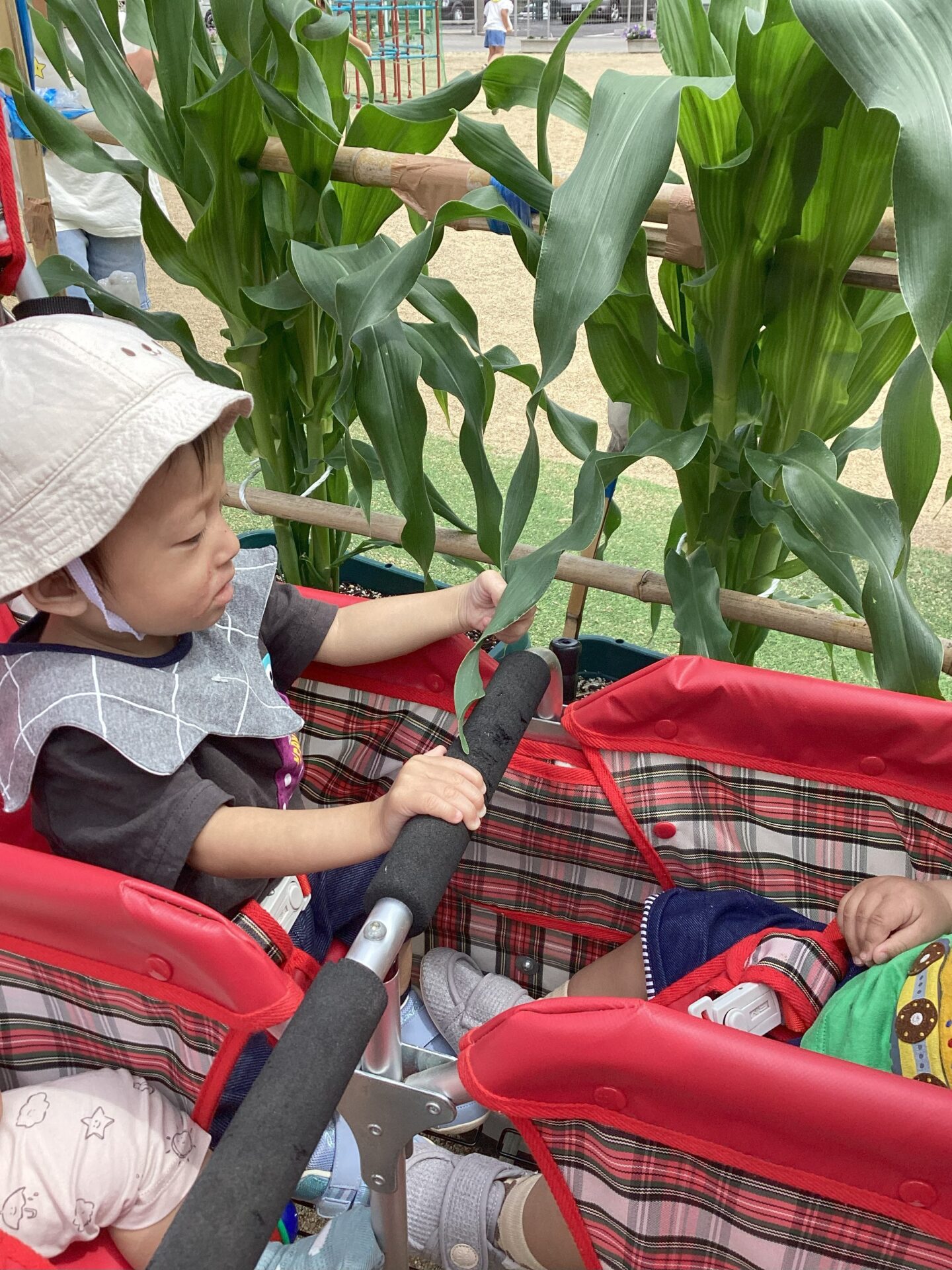 園で栽培している とうもろこしの葉っぱを握ったりと、様々な物に興味津々!