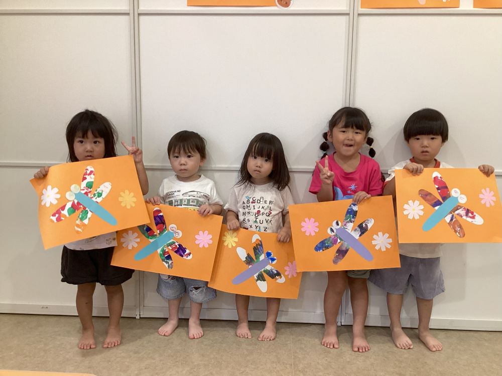 子ども達が初めて筆で模様を描いたものを、トンボの羽に、見立てました。