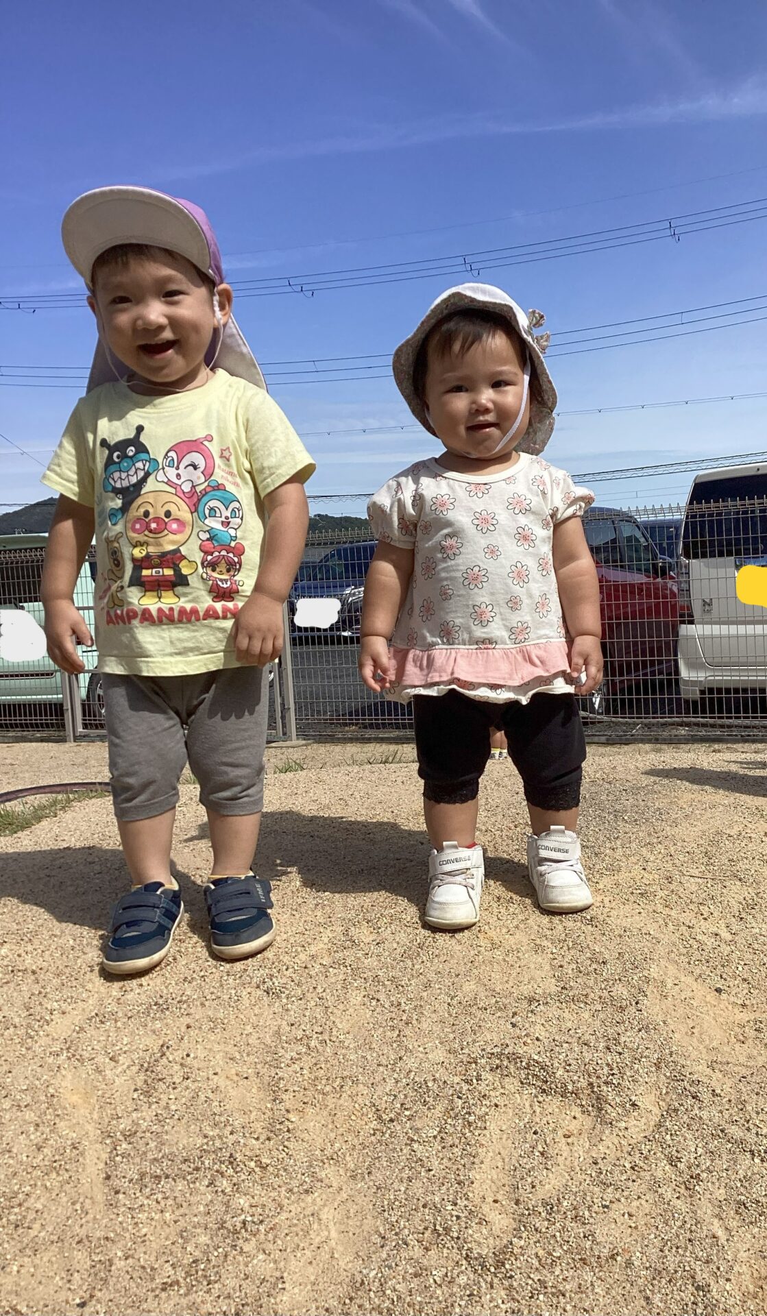 1歳児だいちチームのお友だちと一緒に、築山の上から「お~い!」