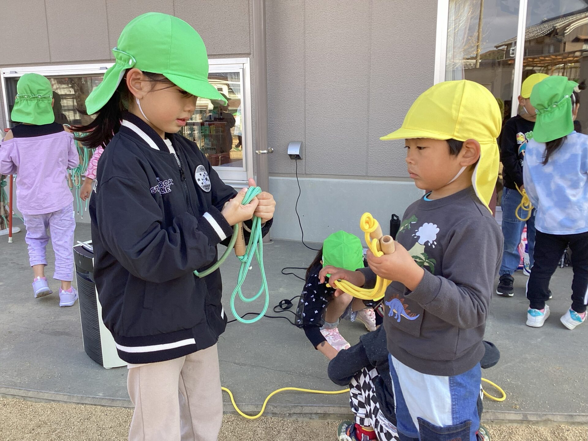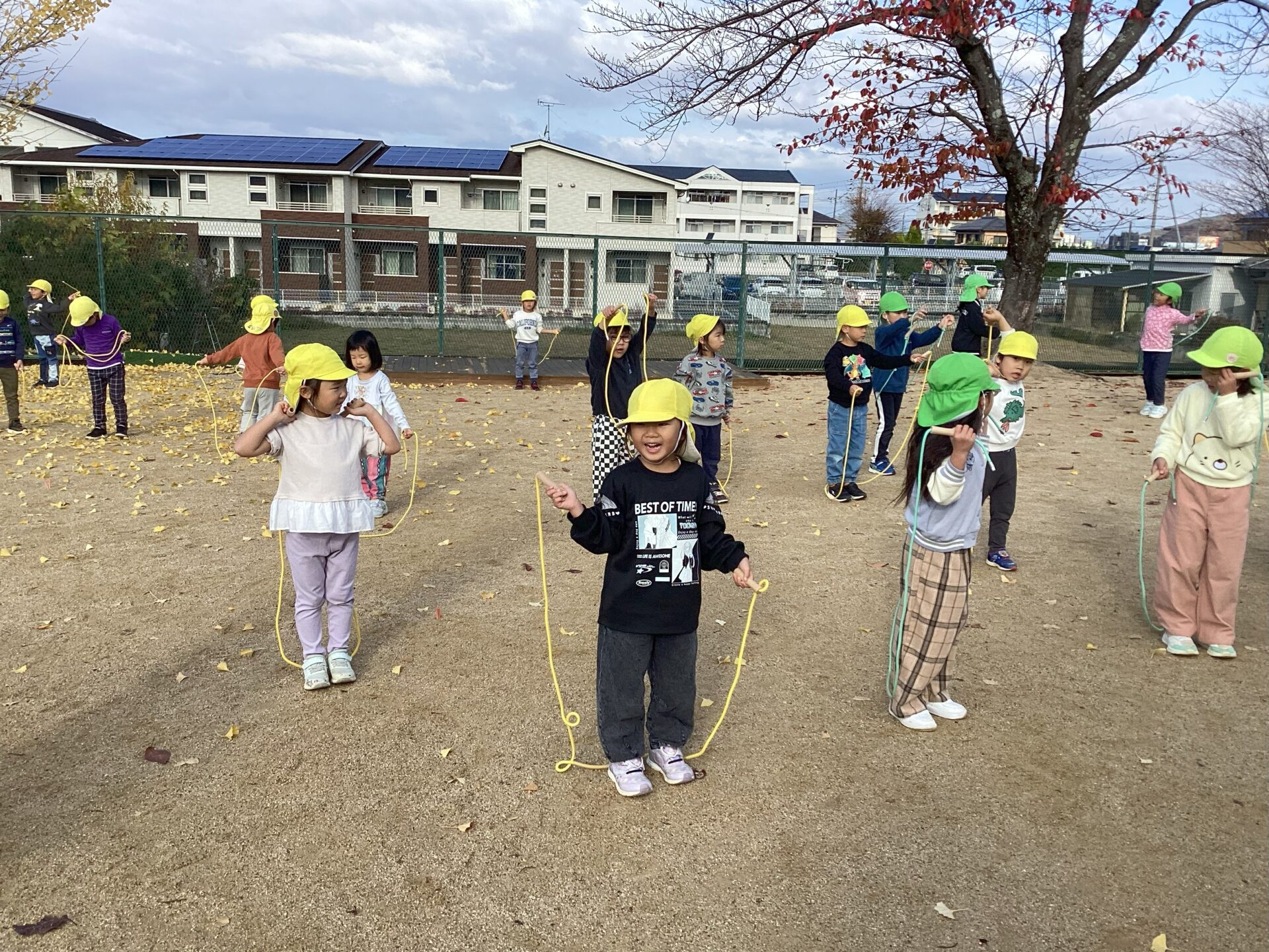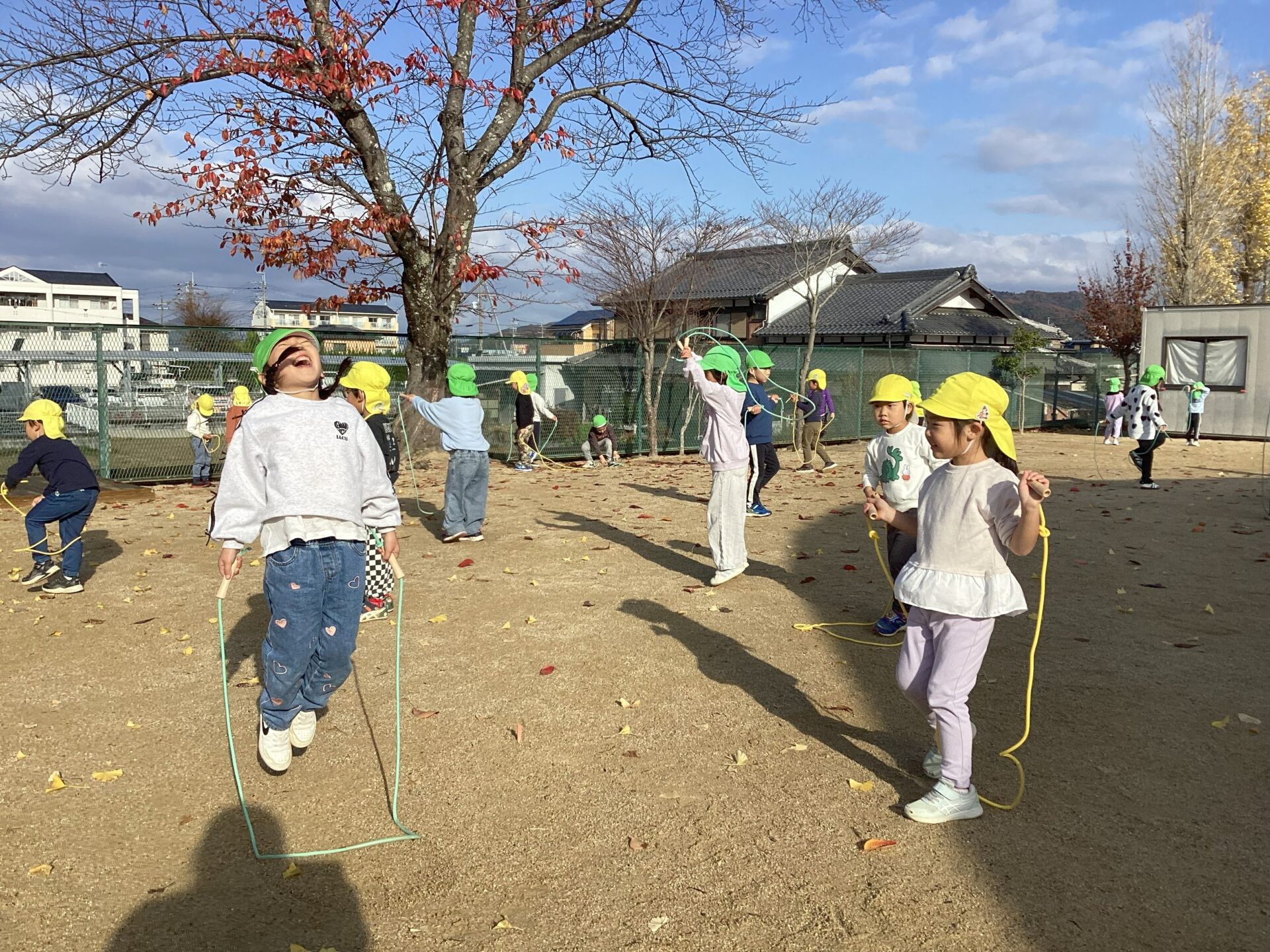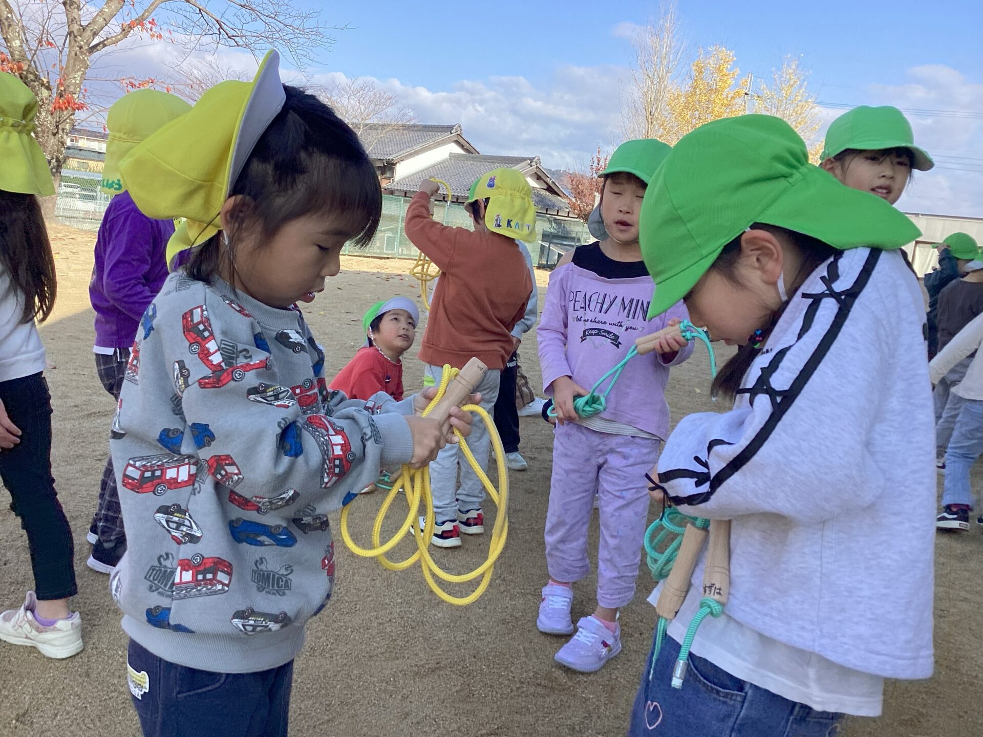 朝の活動として、園庭に出て縄跳びに挑戦している子ども達。