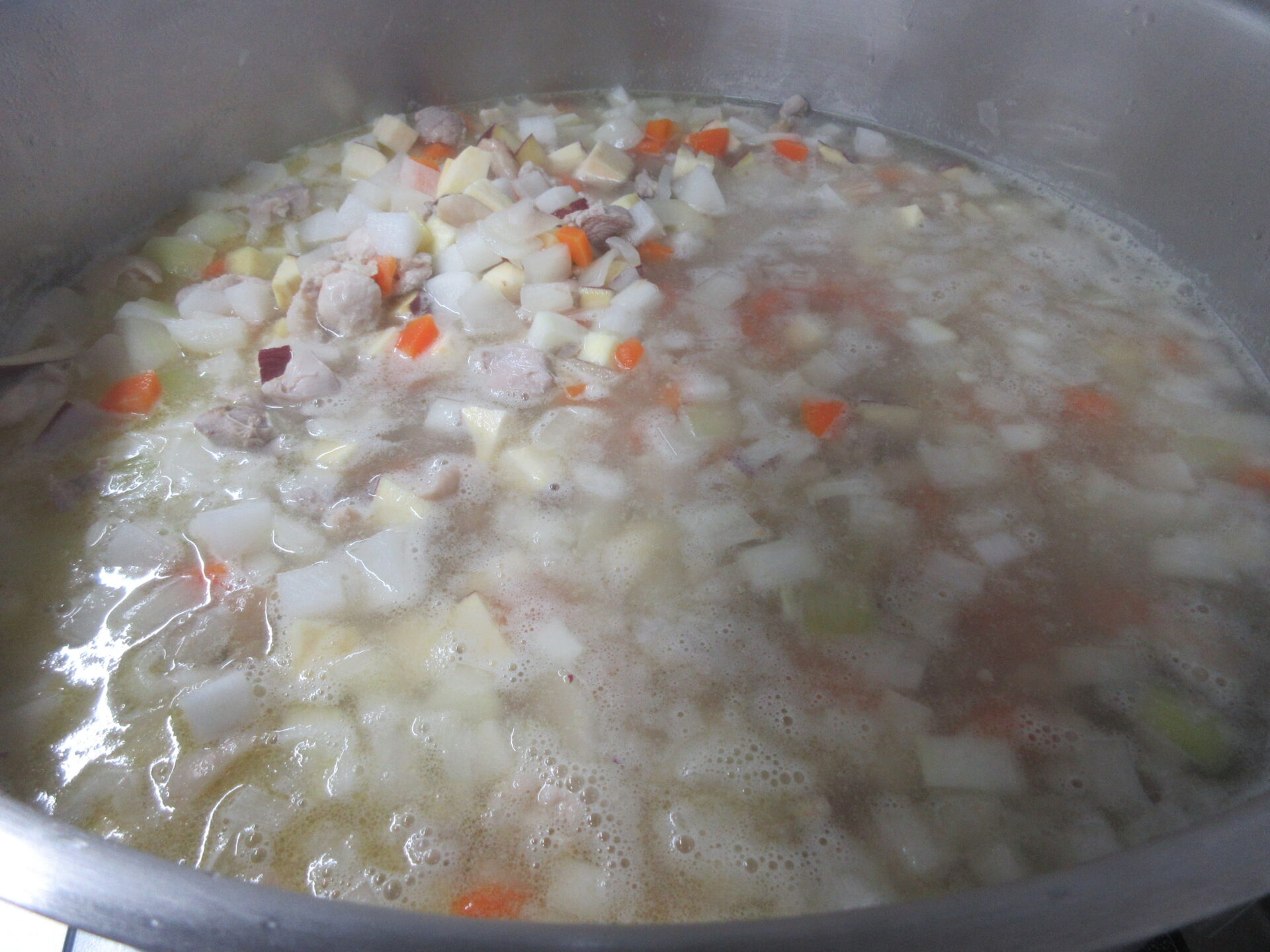 だいこんとさつま芋も入れたら、水を入れて野菜がやわらかくなるまで煮込みます。