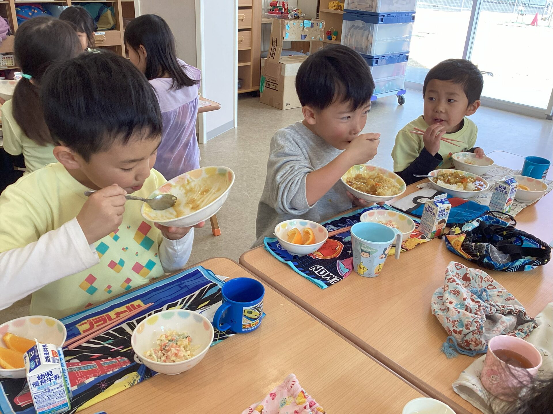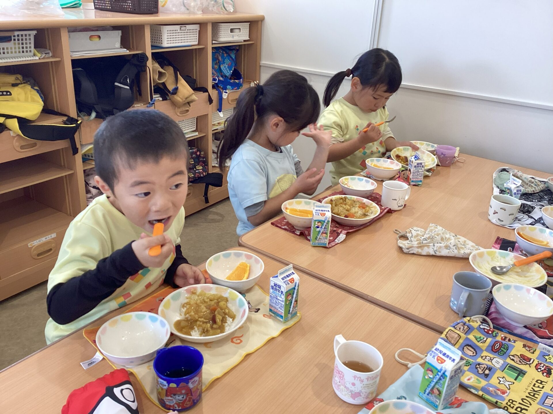 大きな鍋でたくさん煮込んだカレーをお友だちと一緒に食べるとおいしいようで、少し苦手な野菜が入っていてもモリモリ食べてくれる子ども達です。