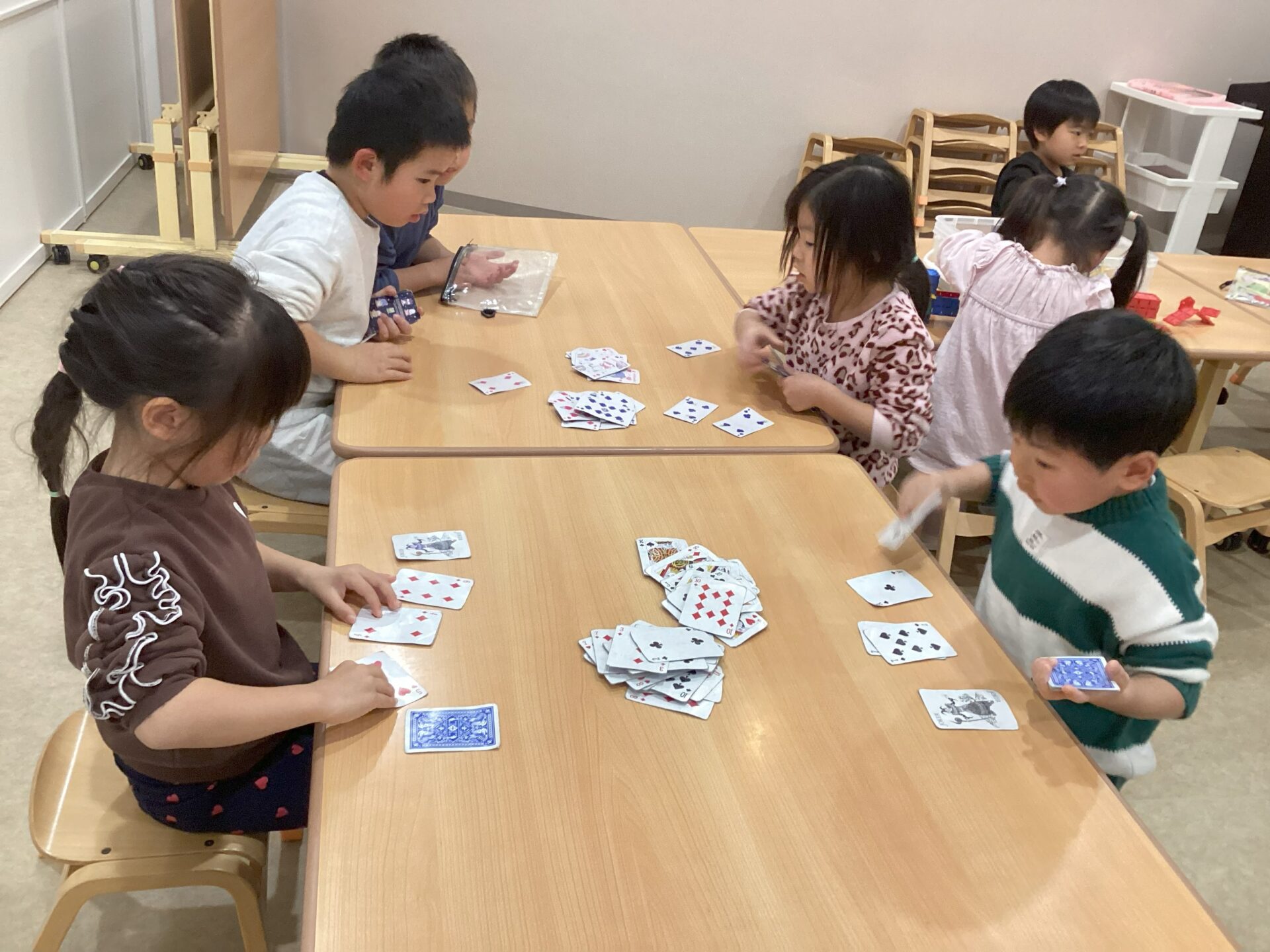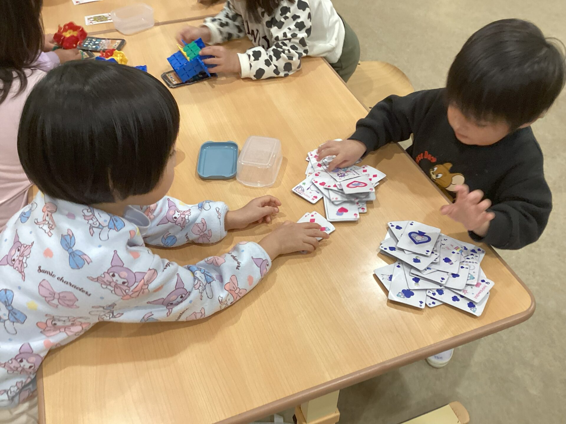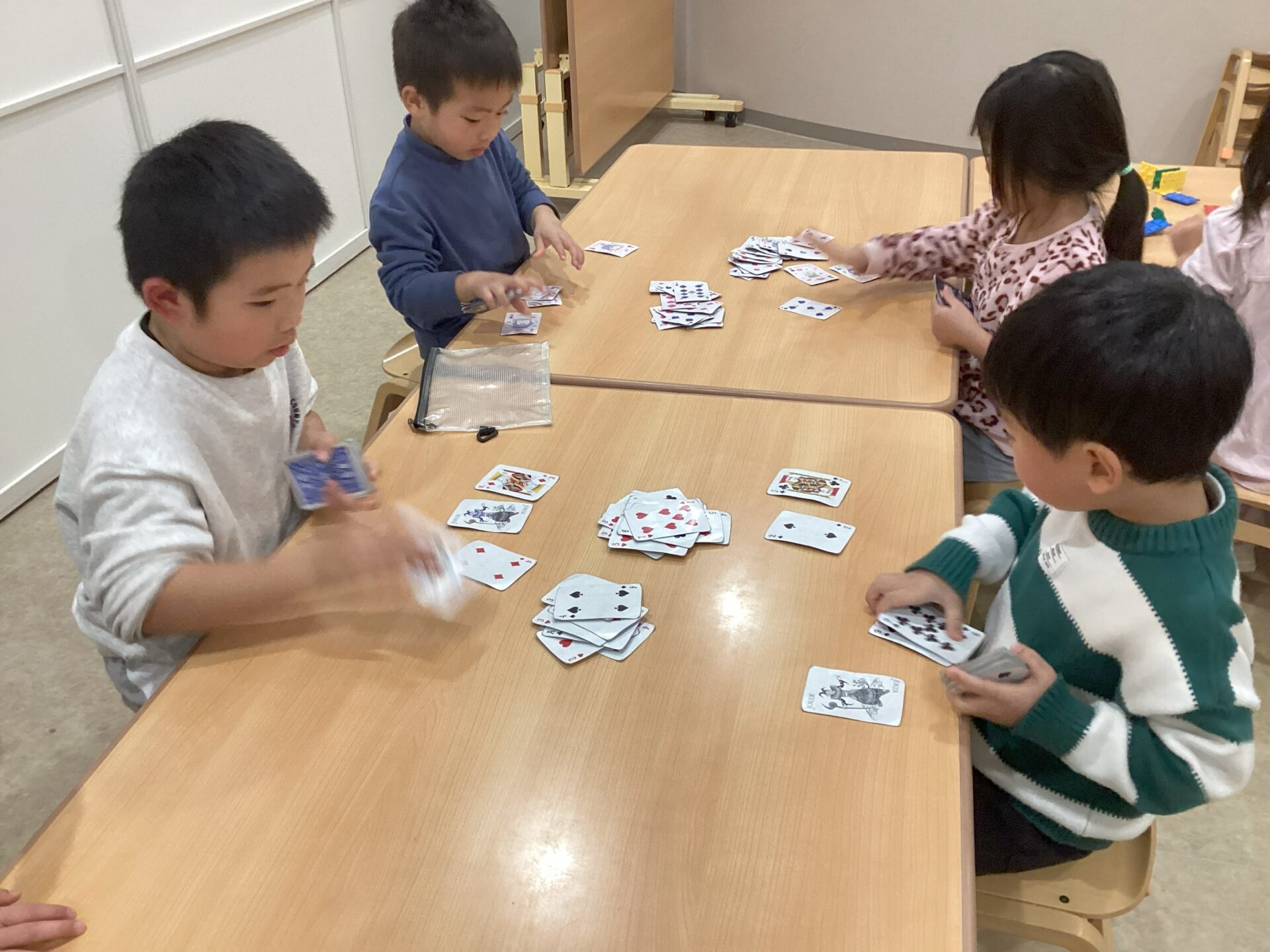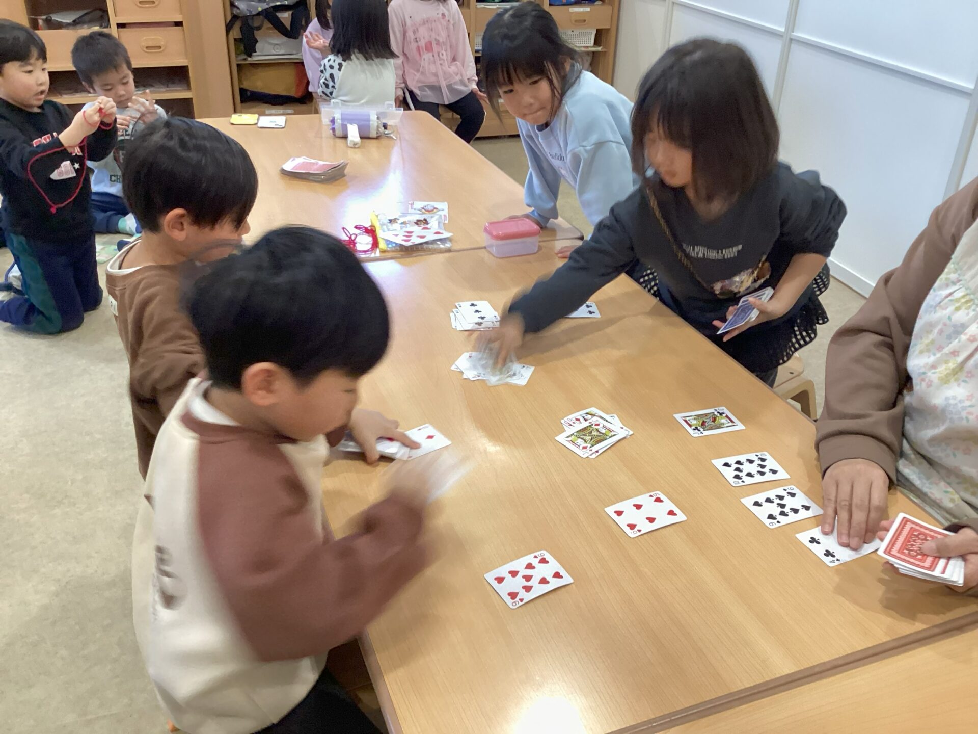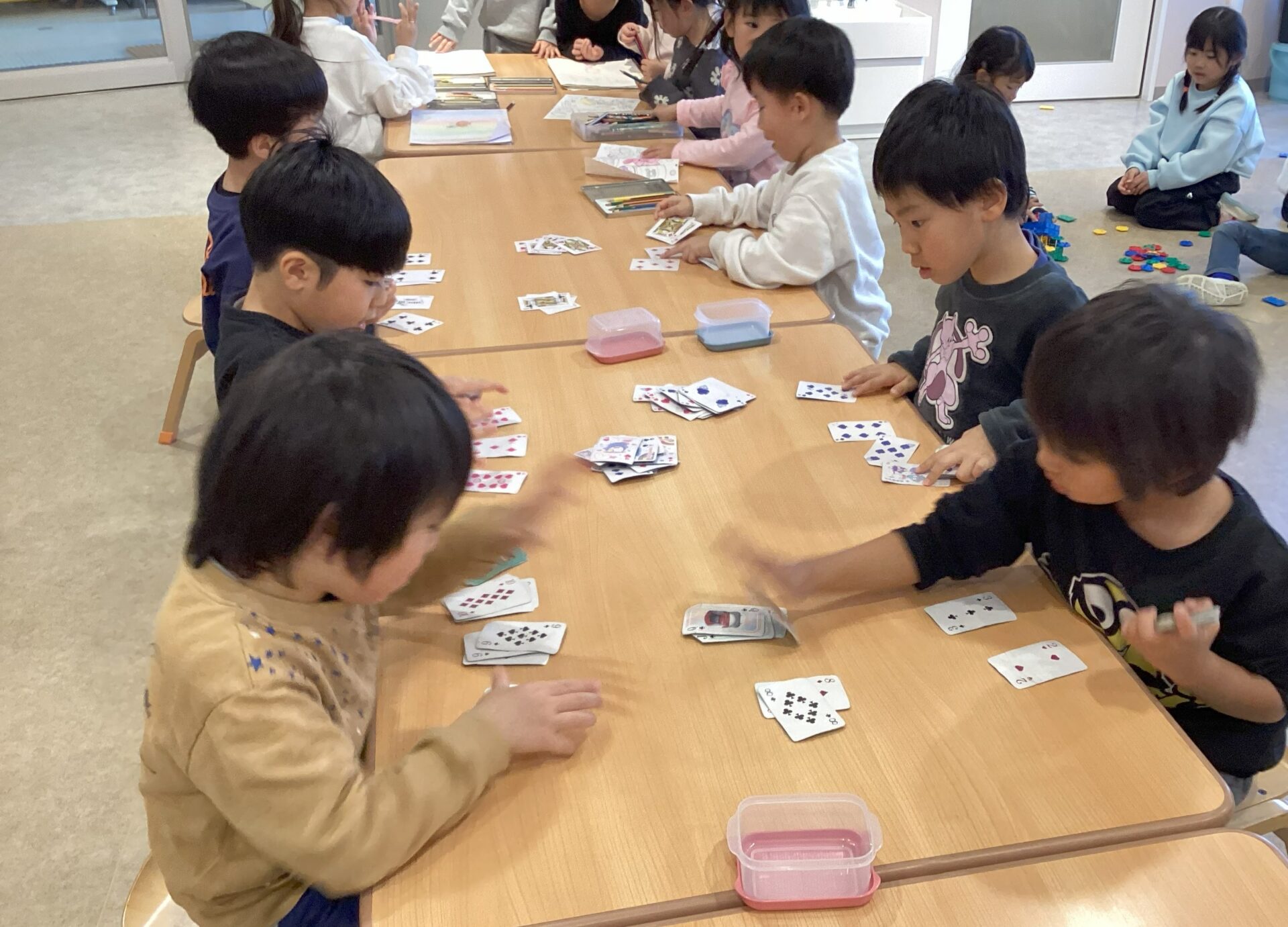 4歳児そらチームと5歳児くじらチームでは、トランプのスピードが流行っています!