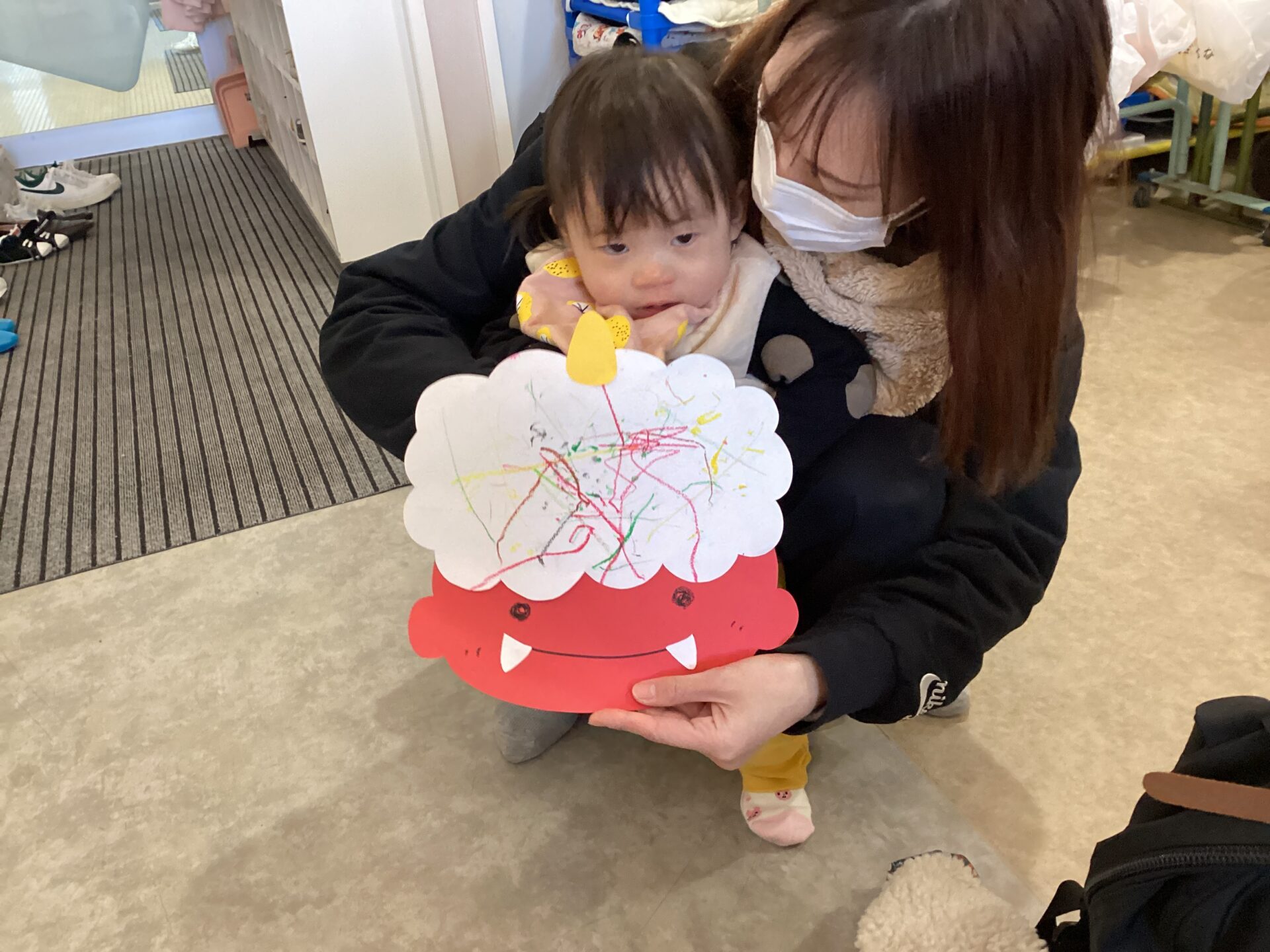 もうすぐ節分ということで、だいちチームのお友達と一緒に鬼づくりでお絵描きを楽しみました。