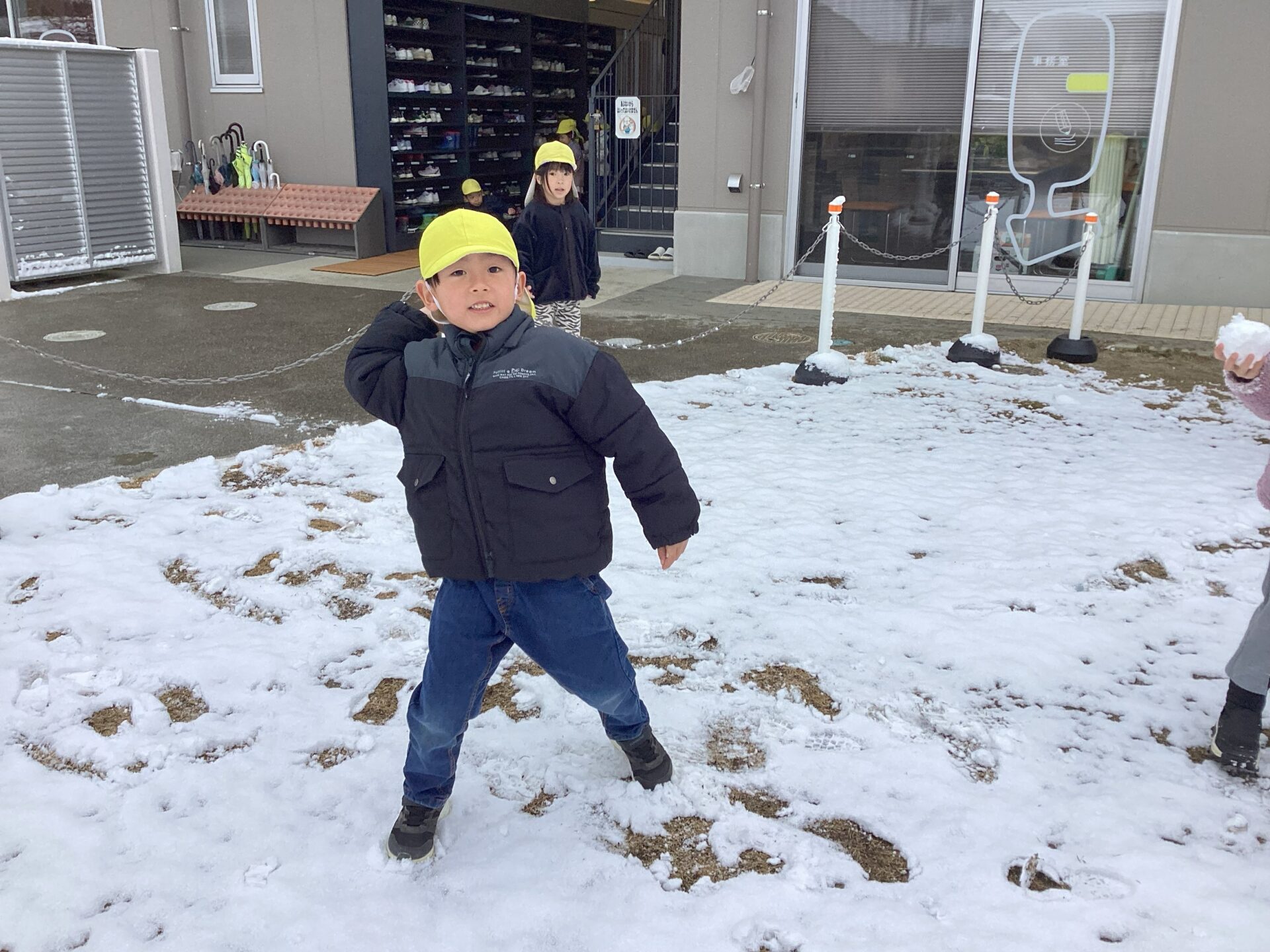 先日、湖南市にも雪が積もり、三雲くじら保育園の園庭も真っ白になりました。