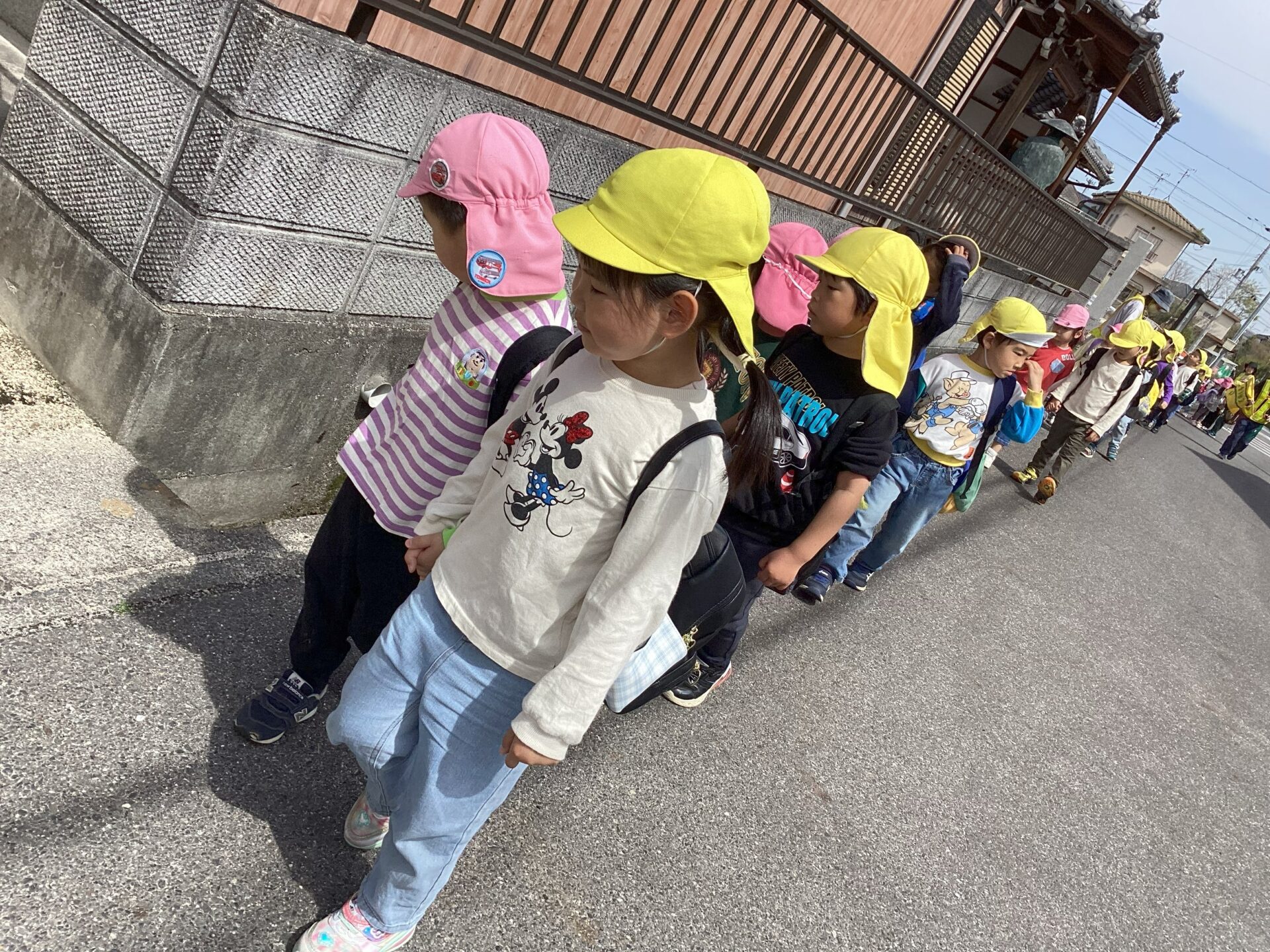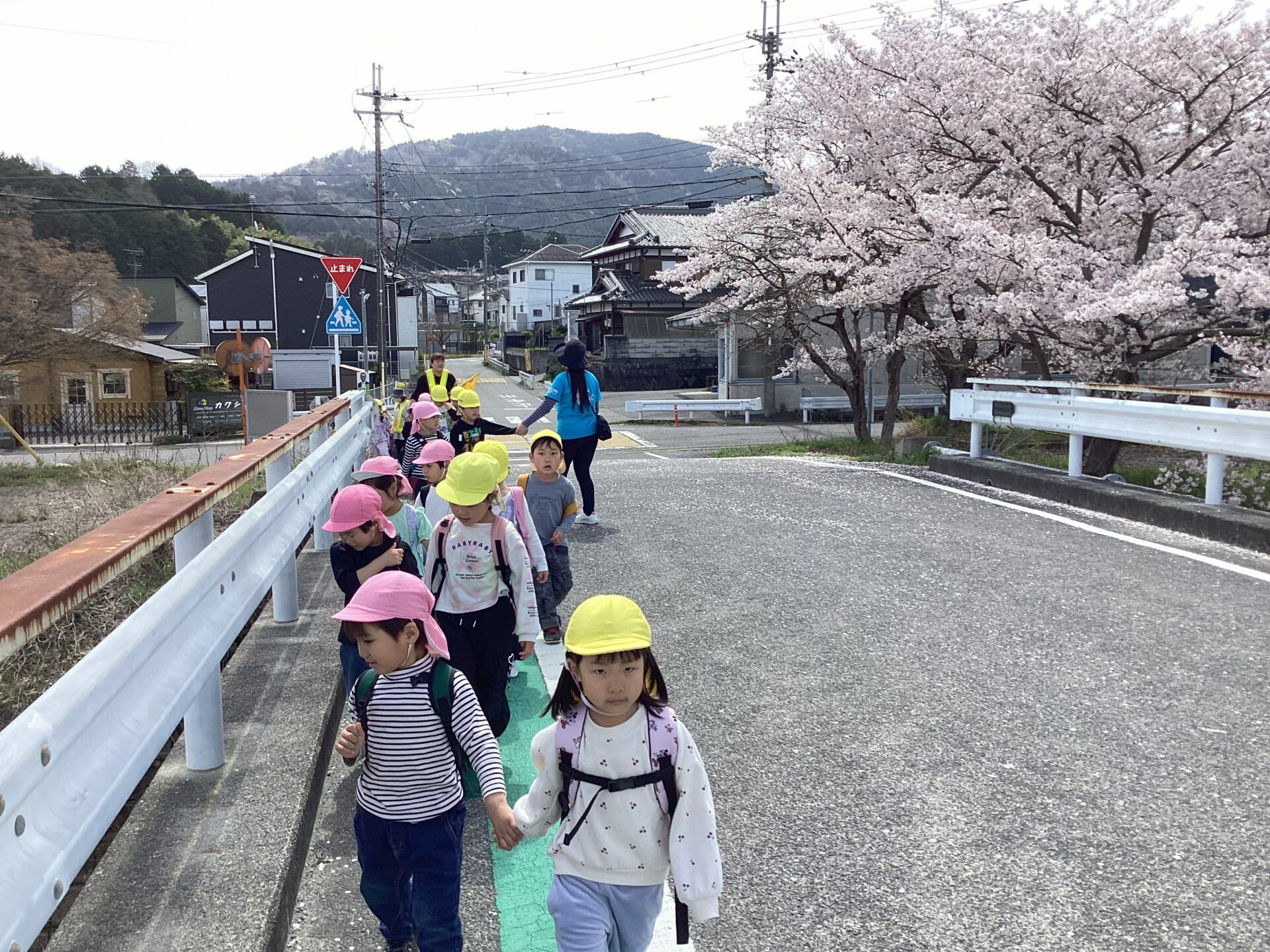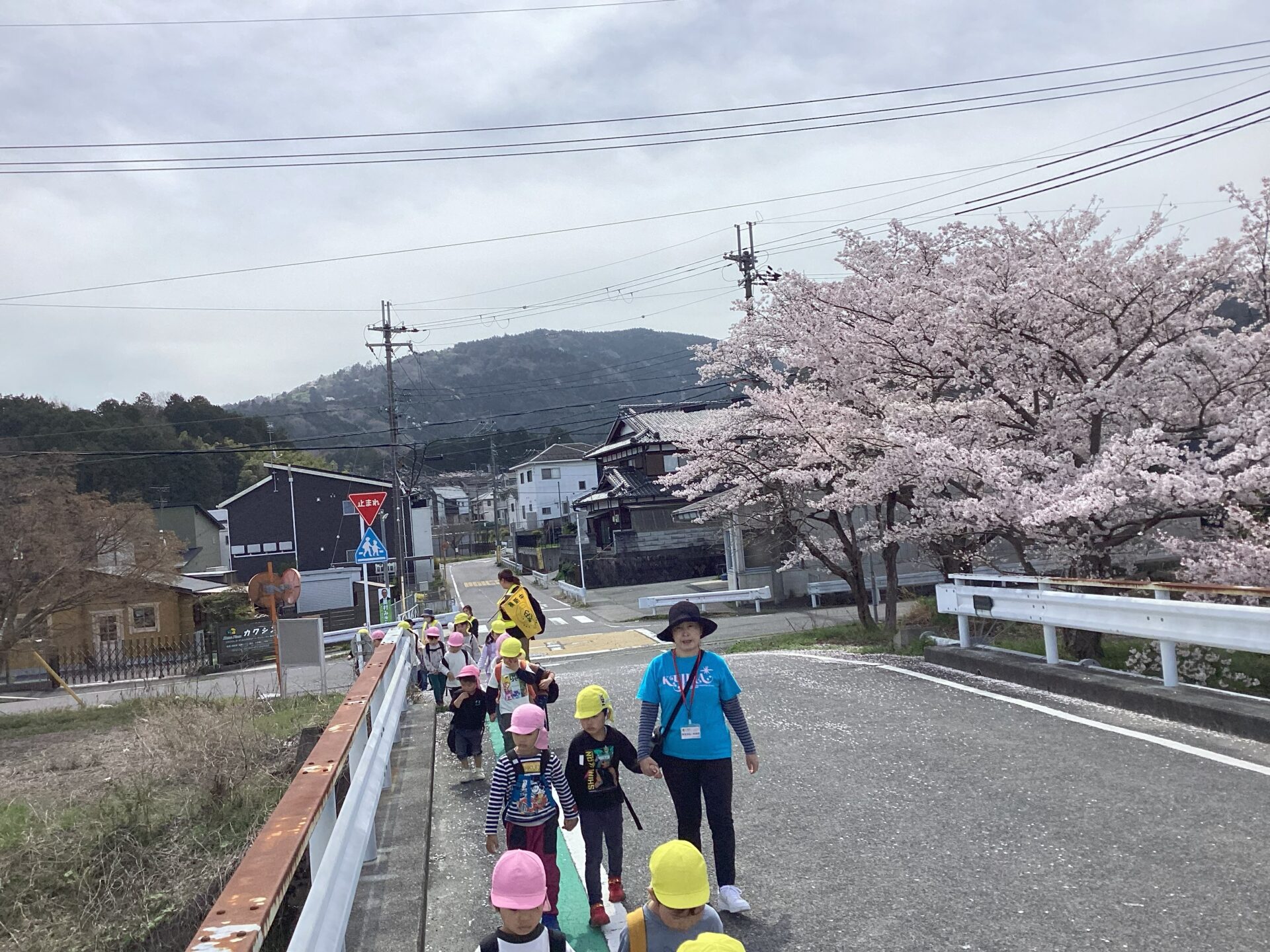 そらチーム・くじらチームのお友達でペアになり、仲良く手を繋いで保育園周辺を散歩しながら桜を見に行きました。