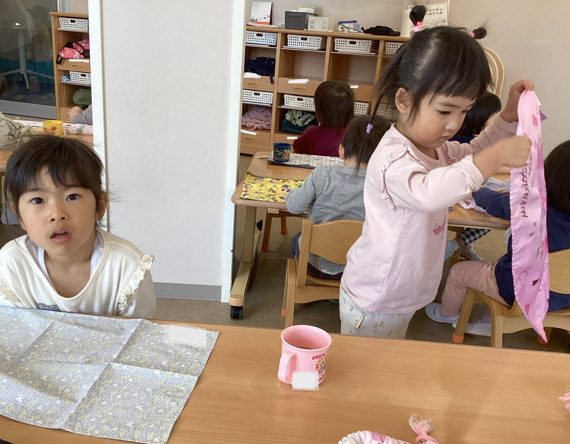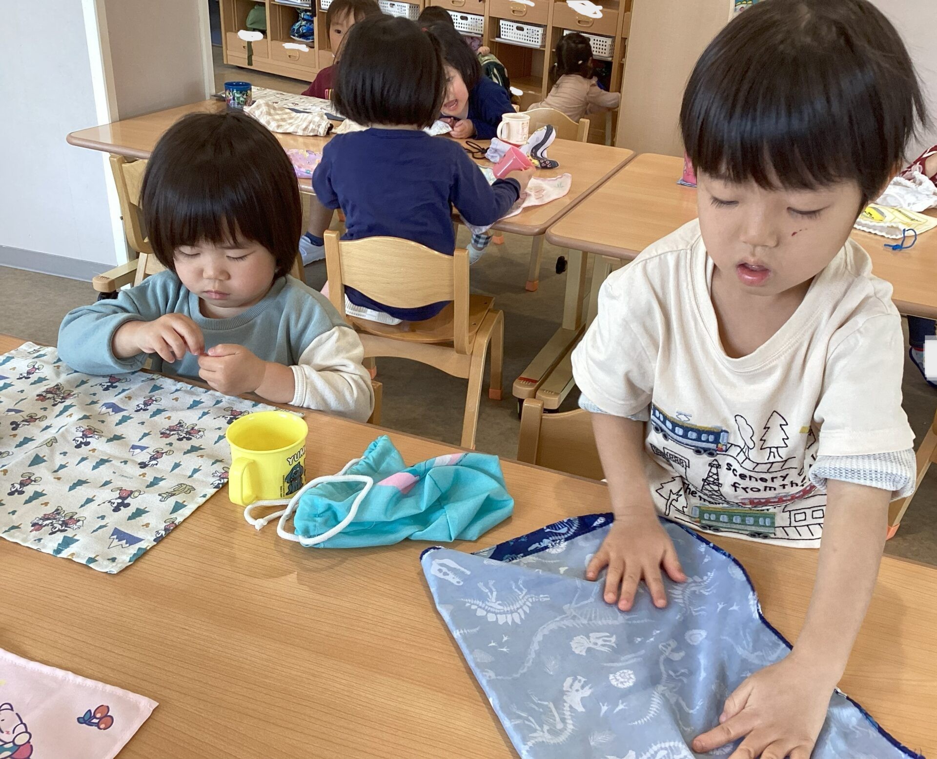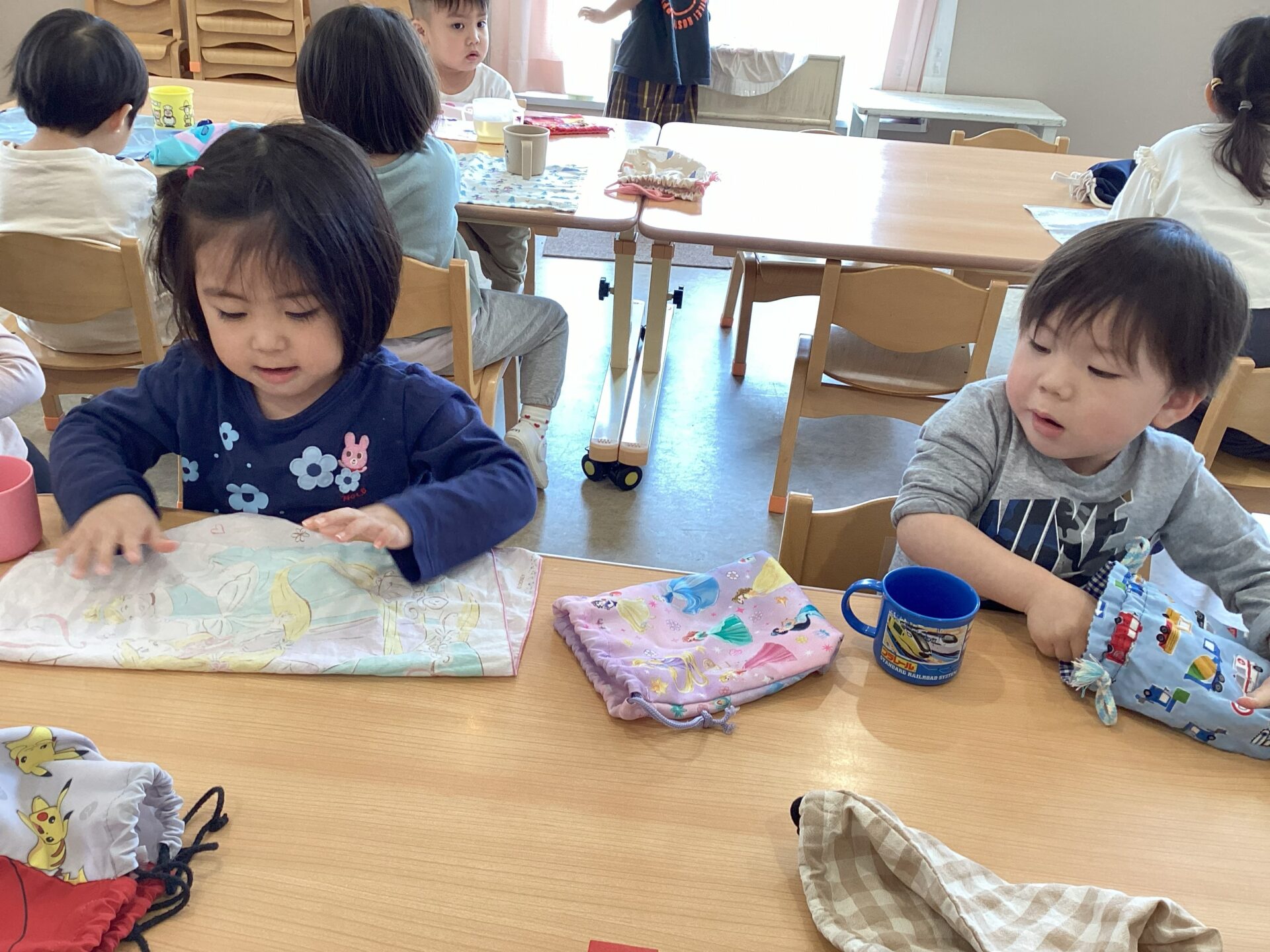 にじチームになり、カバンから巾着を取り、ナフキンを畳んで給食の準備をしています。