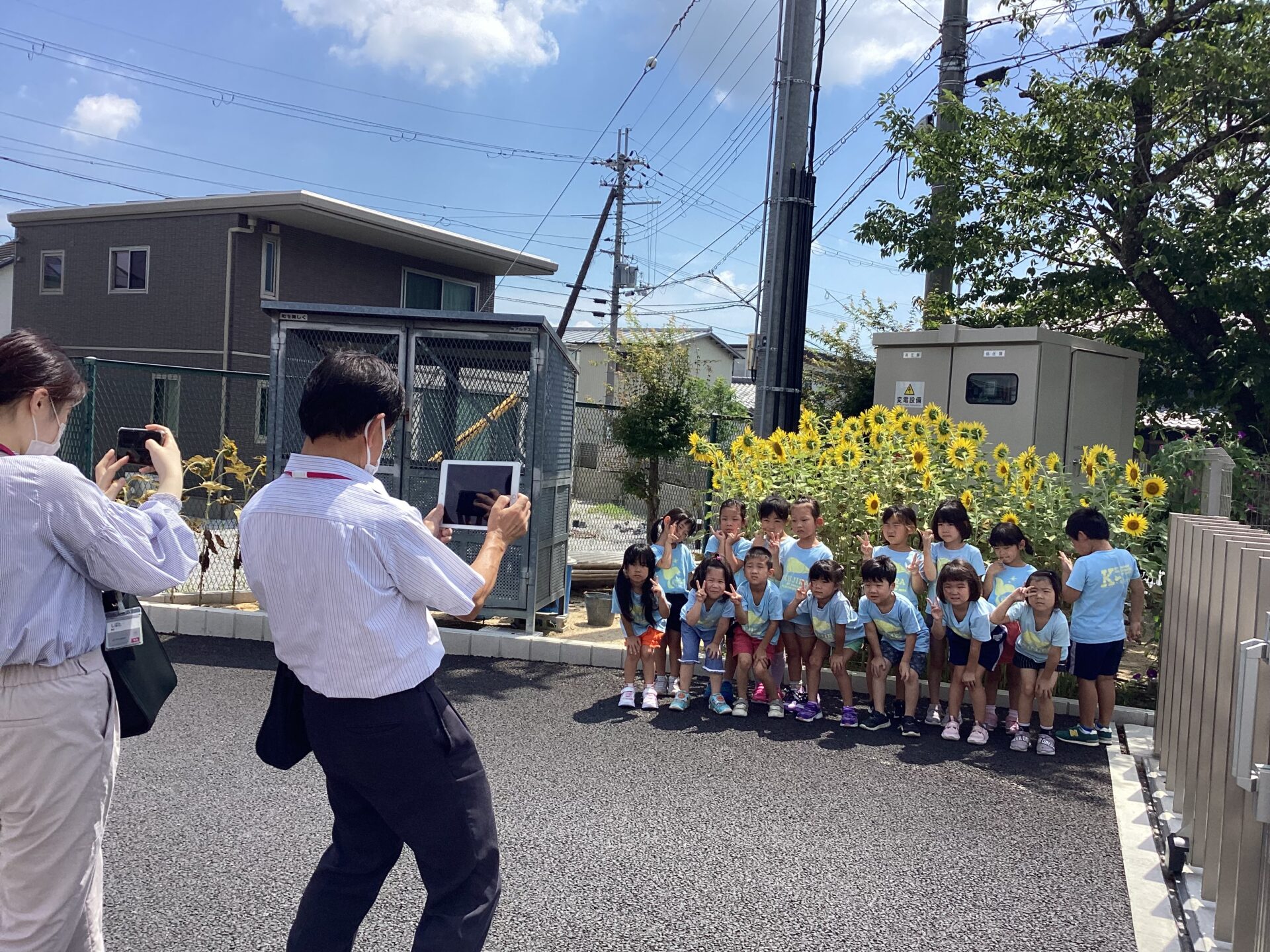 その様子を、早速、担当の方にお伝えをし、太陽が眩しい中の記念撮影会が開催されました!