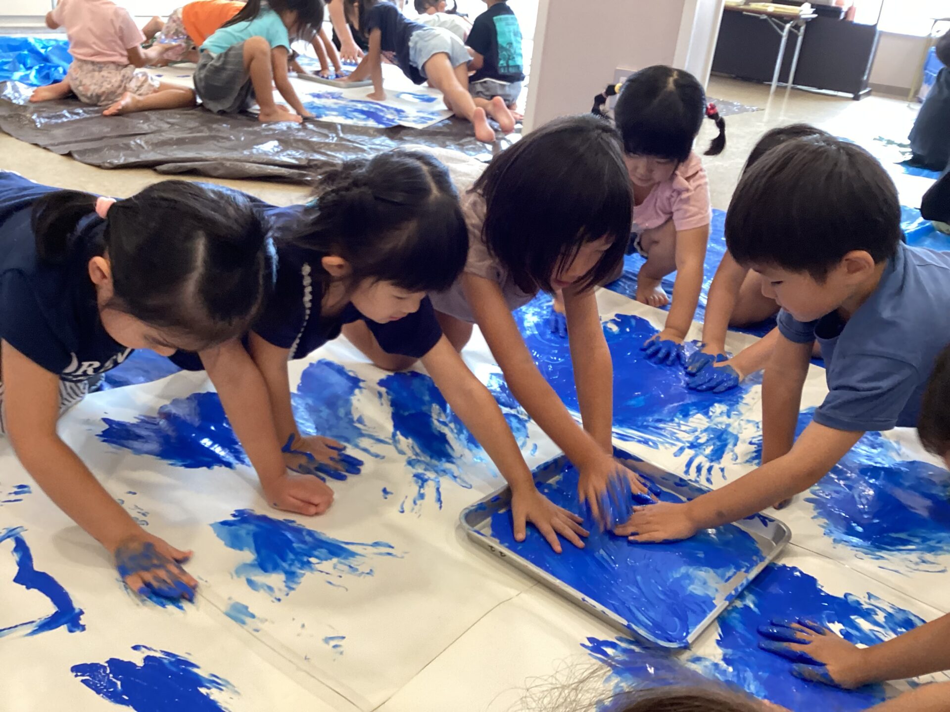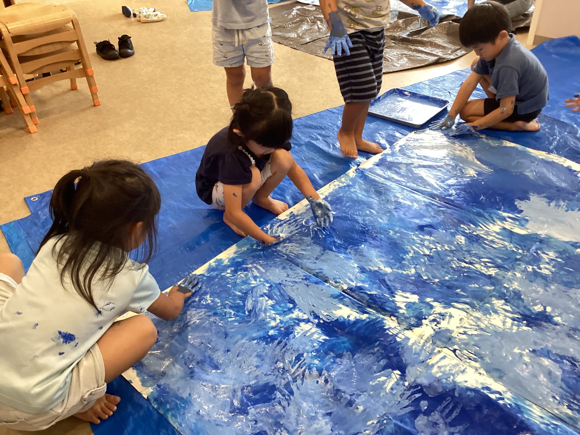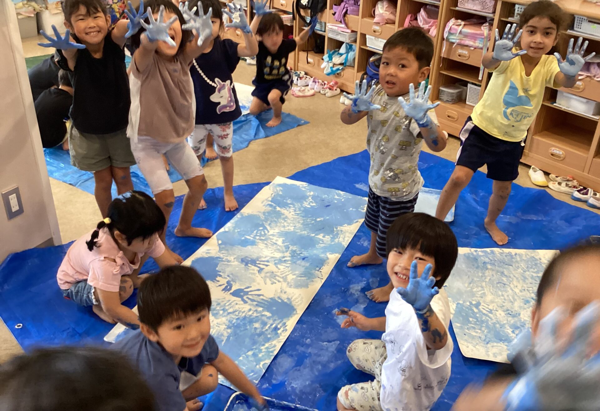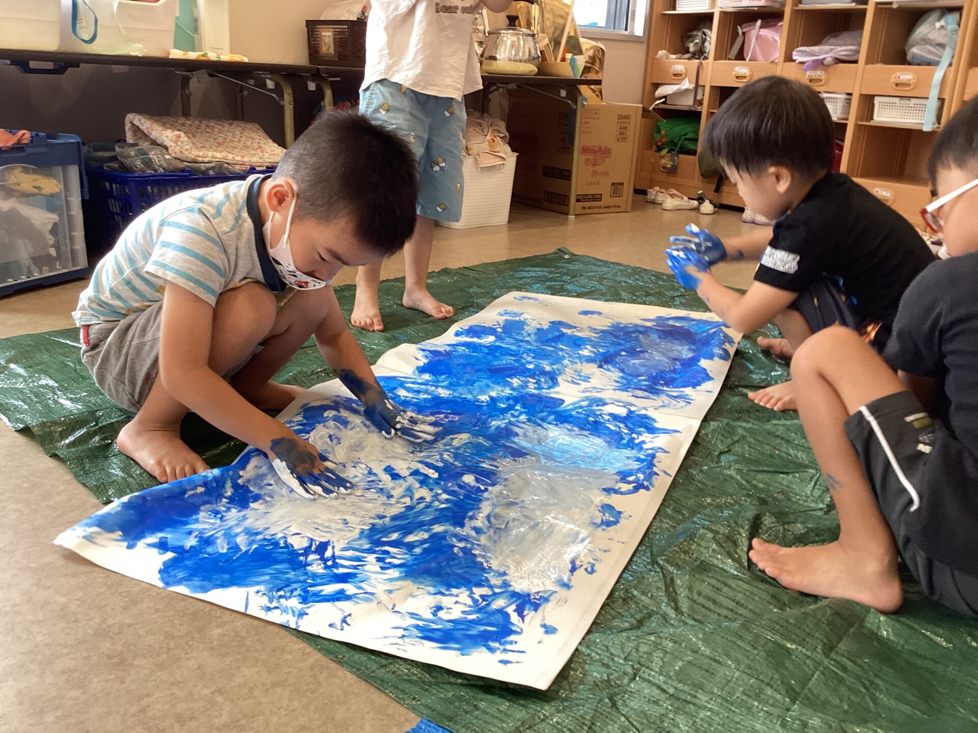 活動終了後、 子ども達の手や服には、絵の具がいっぱいついていて 「手が海になっちゃった♪」と、友達や保育士等と笑顔でやり取りを楽しんでいました。