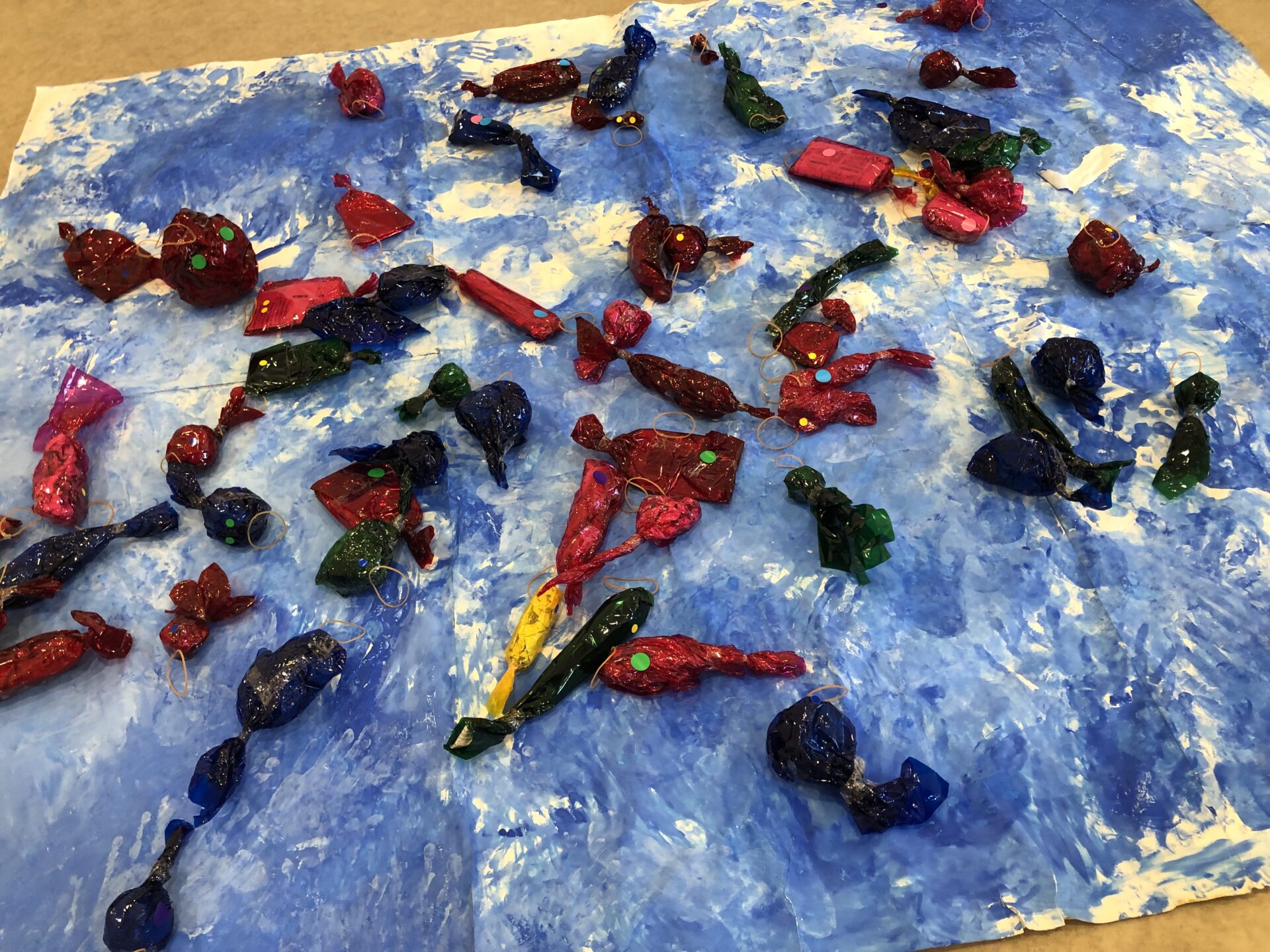 そんな子ども達と作った素敵な作品は、 お祭り当日、 お魚が気持ちよさそうに泳いでいる海や、 お客さんをお出迎えする素敵な看板にもなりました。