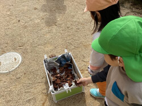 と、保育士等が声を掛けると、段ボールに溢れるほどの落ち葉を拾う子ども達。