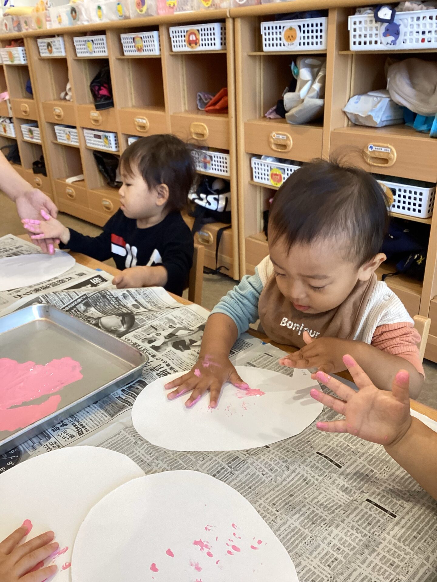 始めは手についた絵の具を恐る恐る画用紙にこすりつける様子がありましたが、