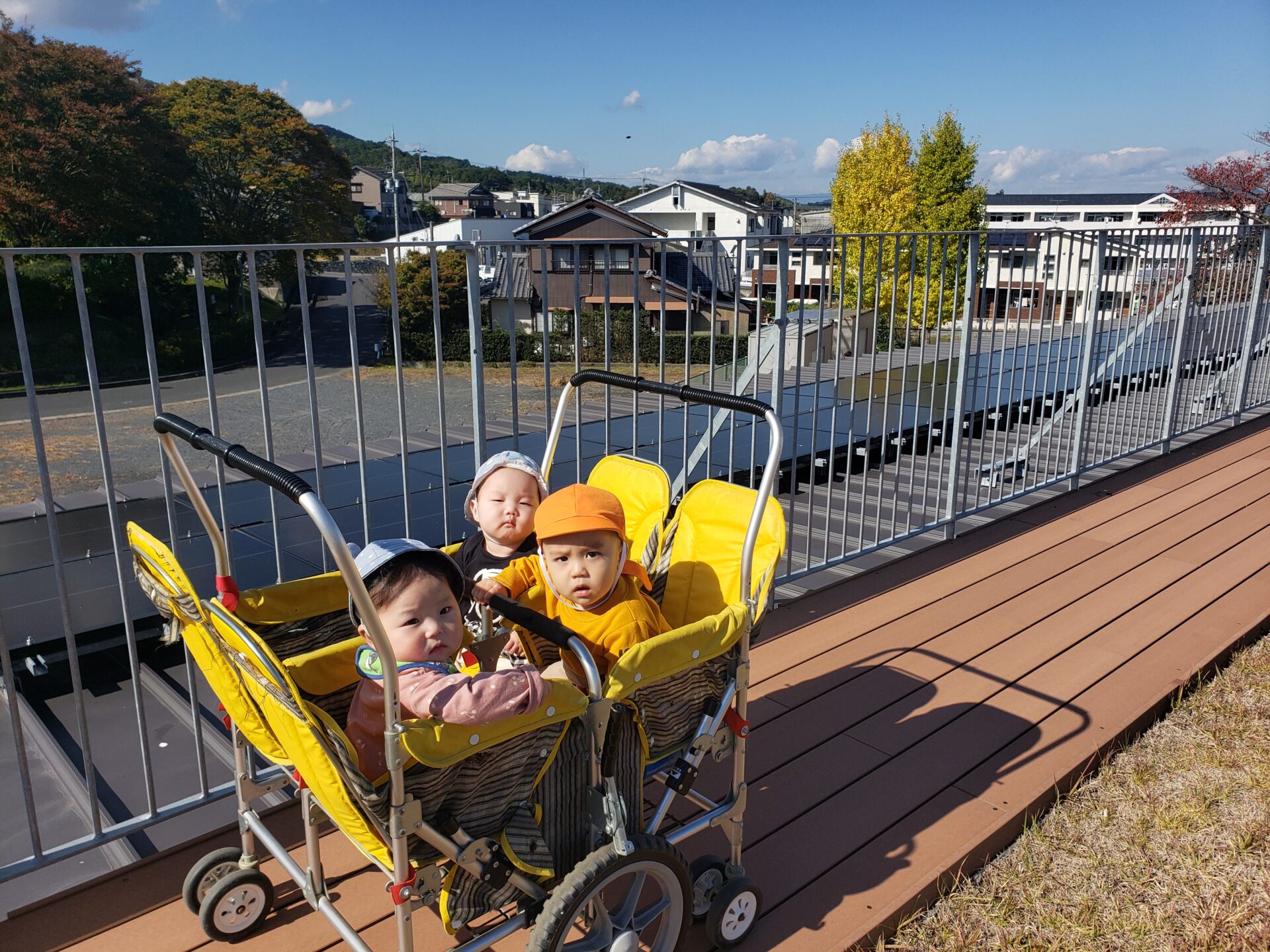 ぽかぽかと、暖かい日は散歩車に乗って園庭や園舎周りを散策するのが日課のうみチーム!