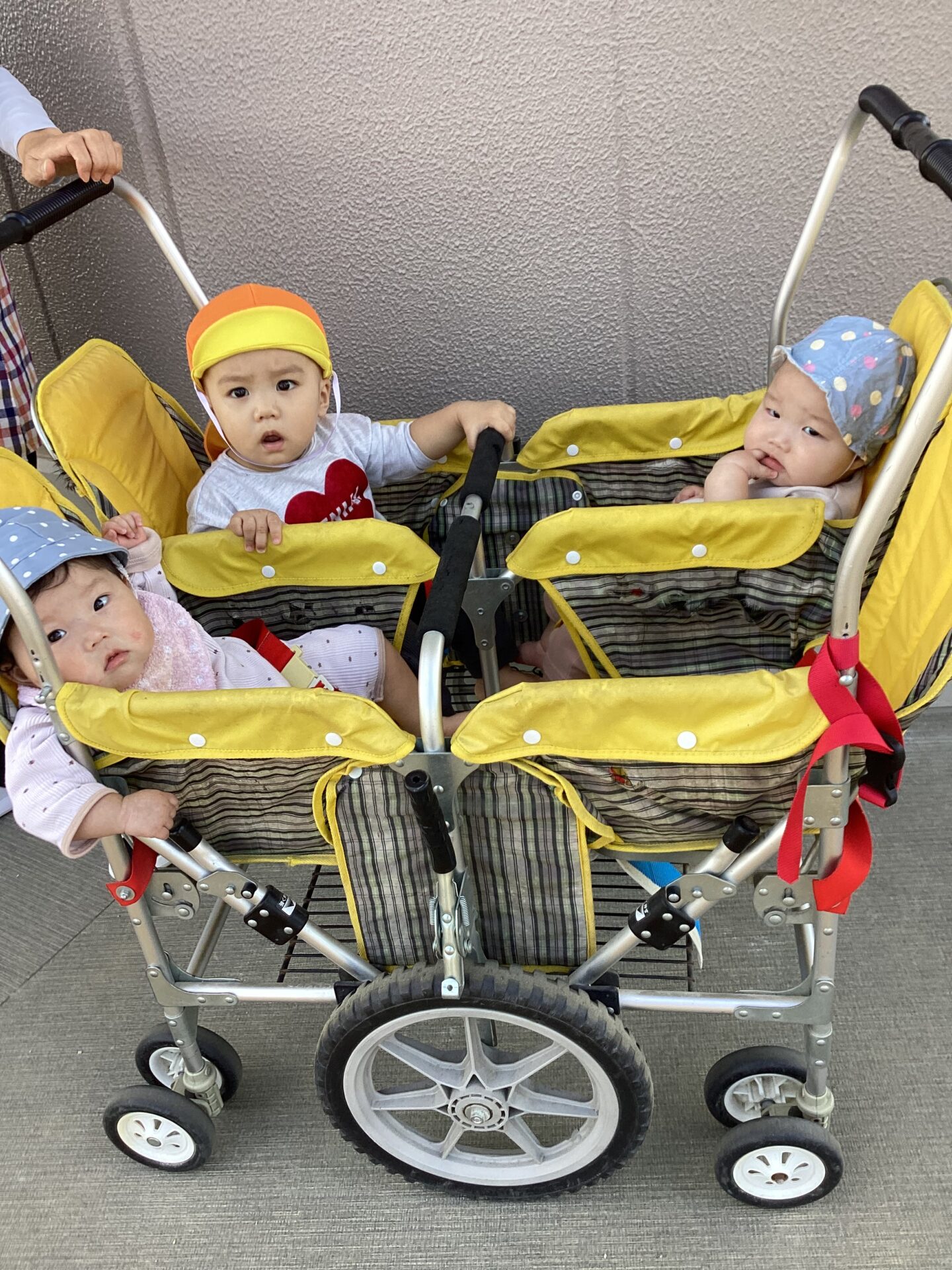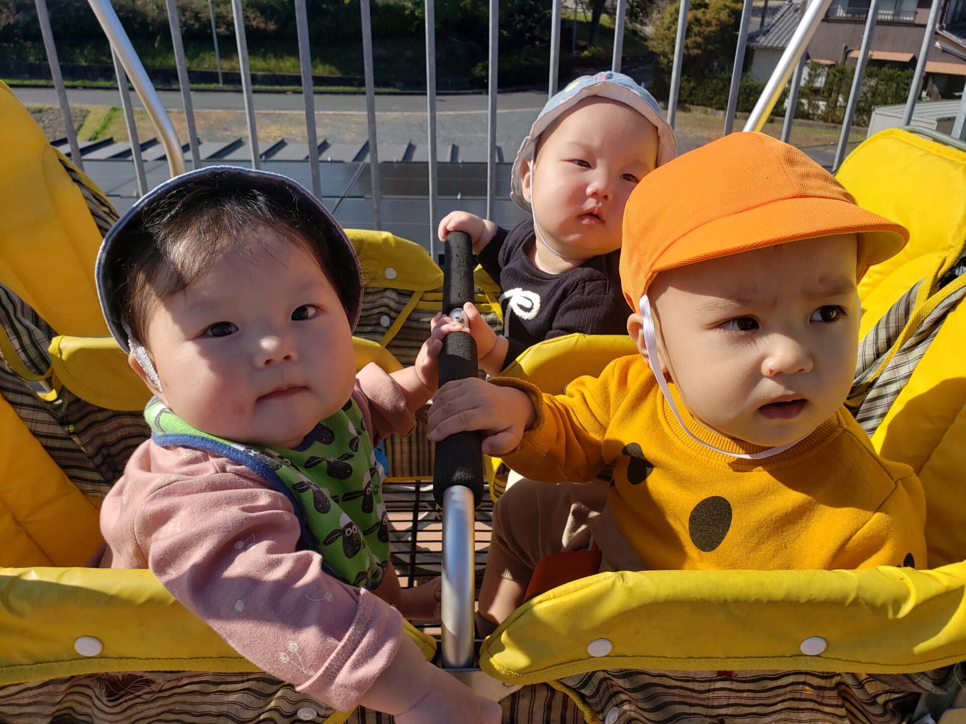 不安定だったお座りも安定してきて、3人揃って散歩車に乗る機会も増えてきました。