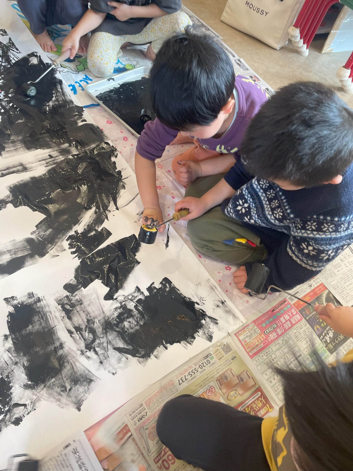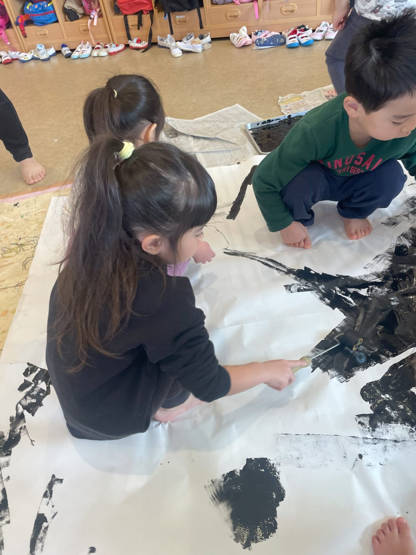 子ども達は劇に出てくる真っ黒の画用紙にローラーを使って作りました。大きな画用紙を見て大喜びの子ども達です。