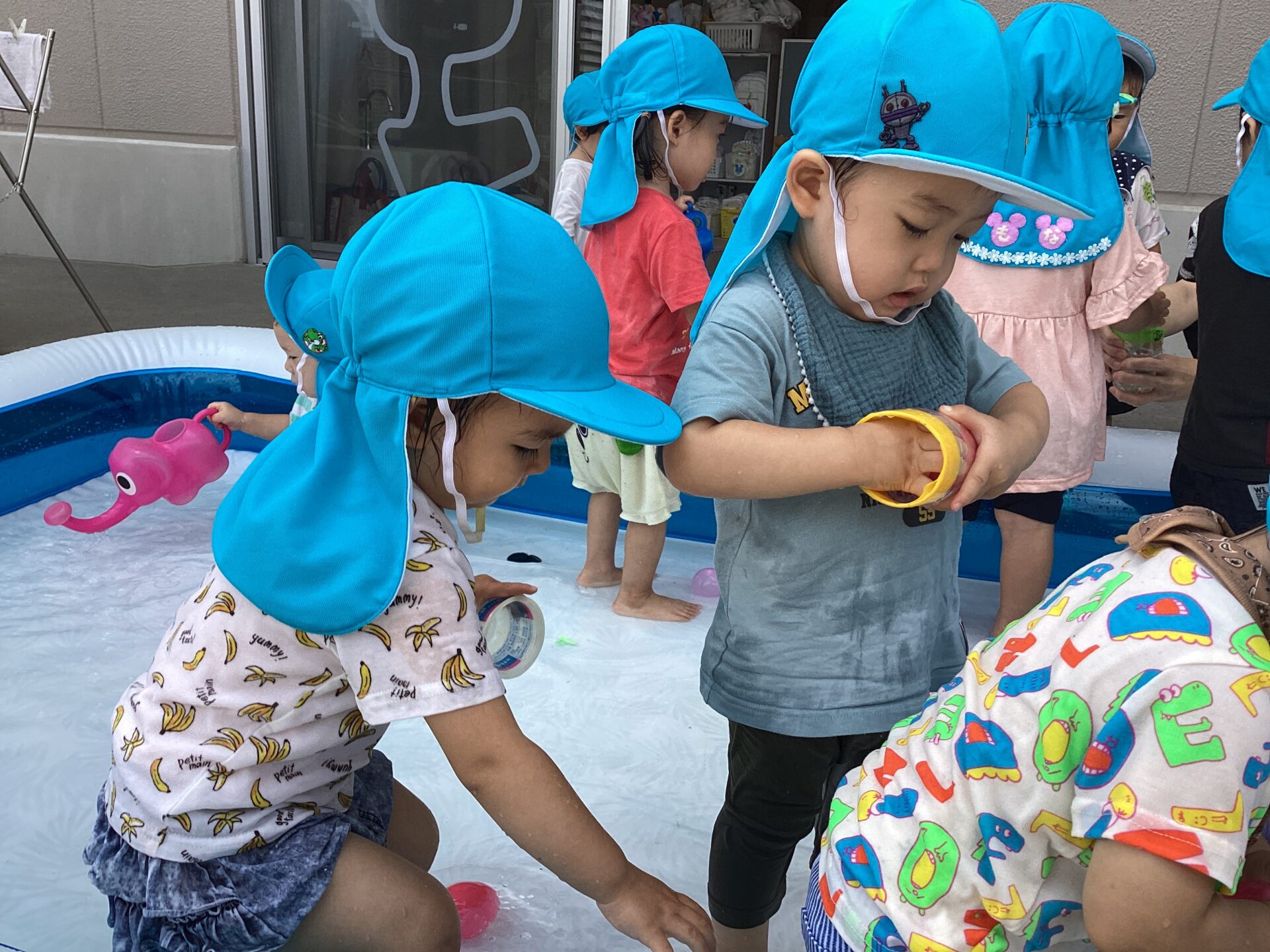 天気の良い日は、色水遊びや泡遊び、プール遊び等、夏ならではの遊びを楽しんでいます。