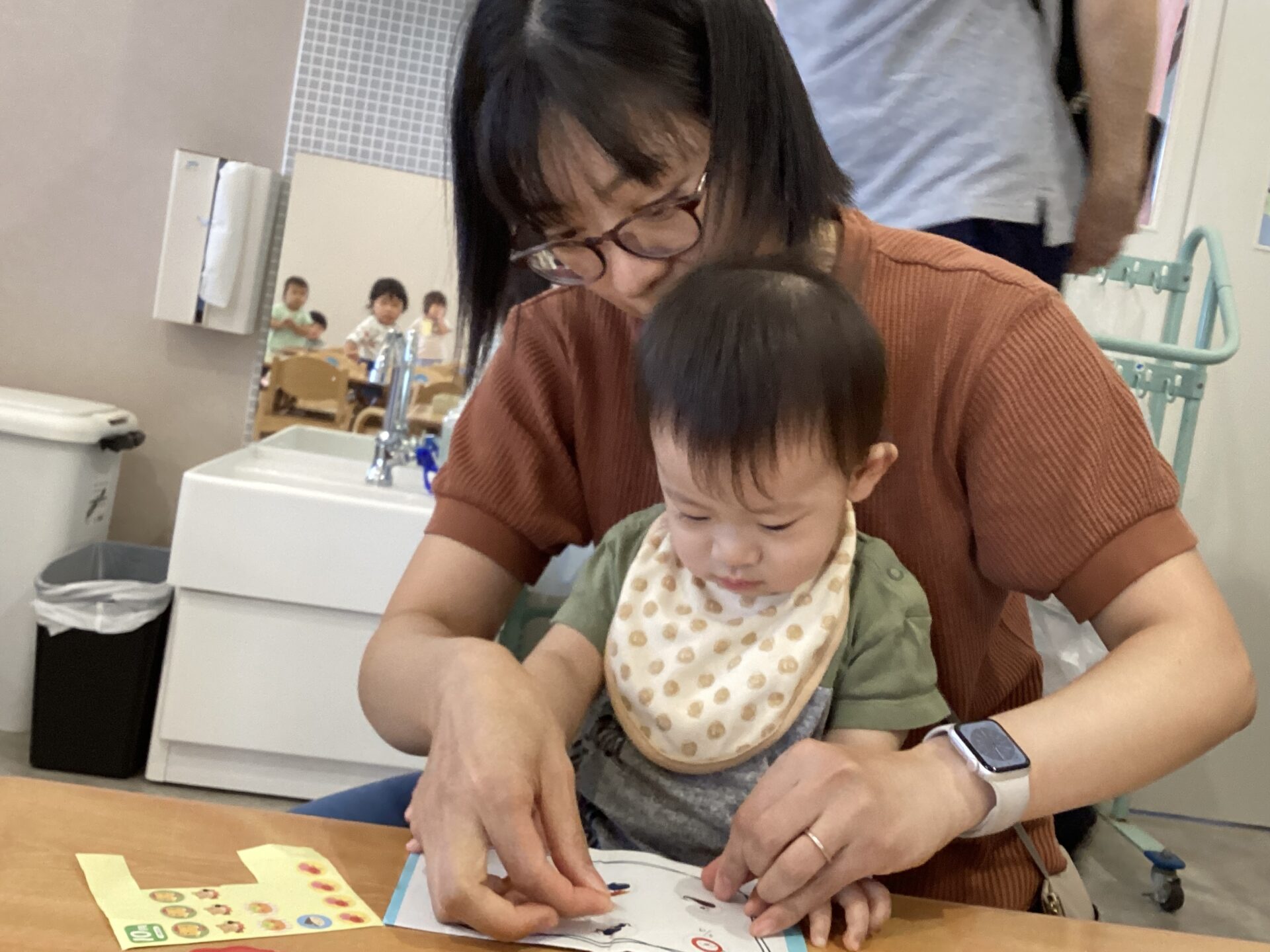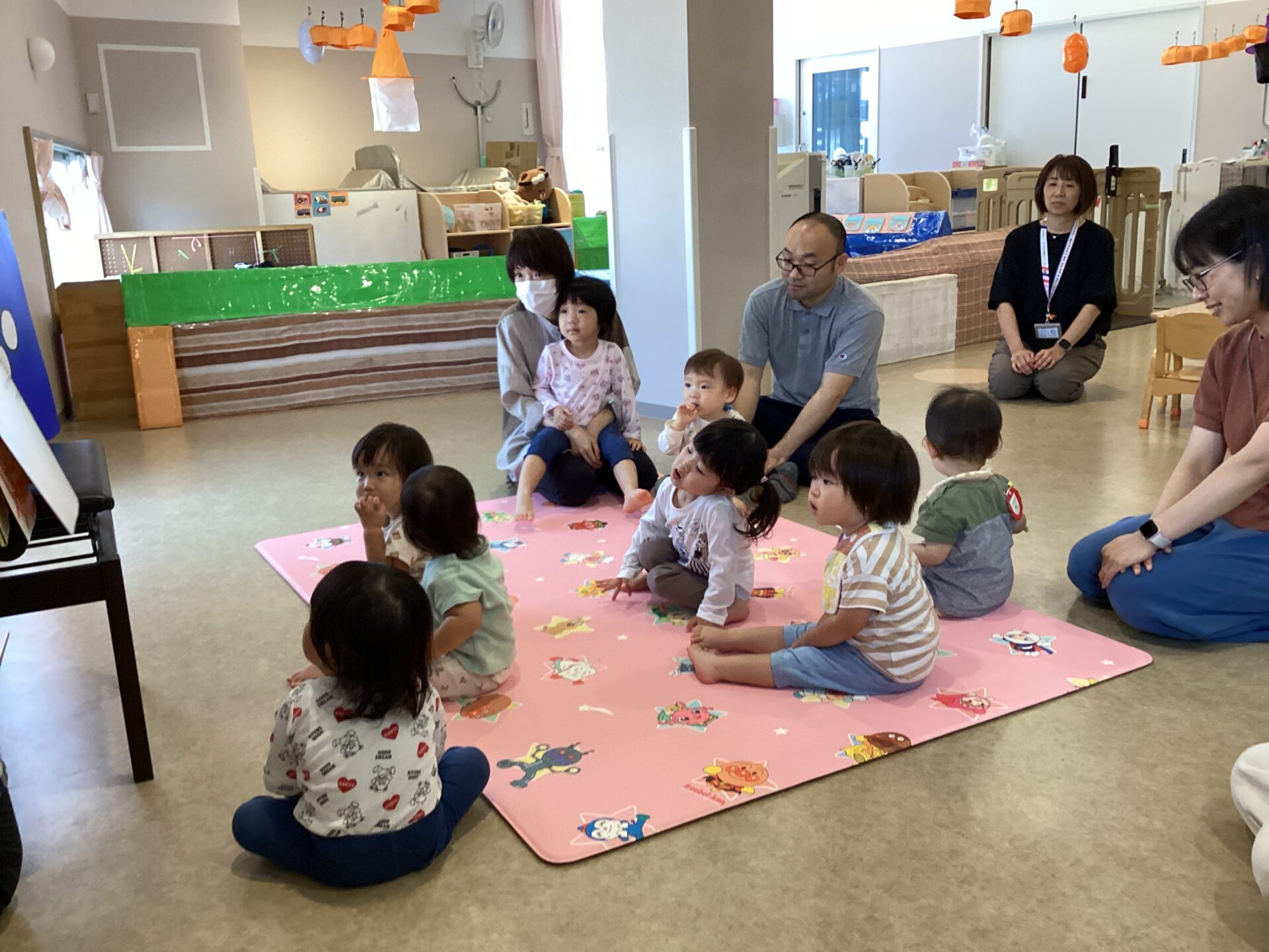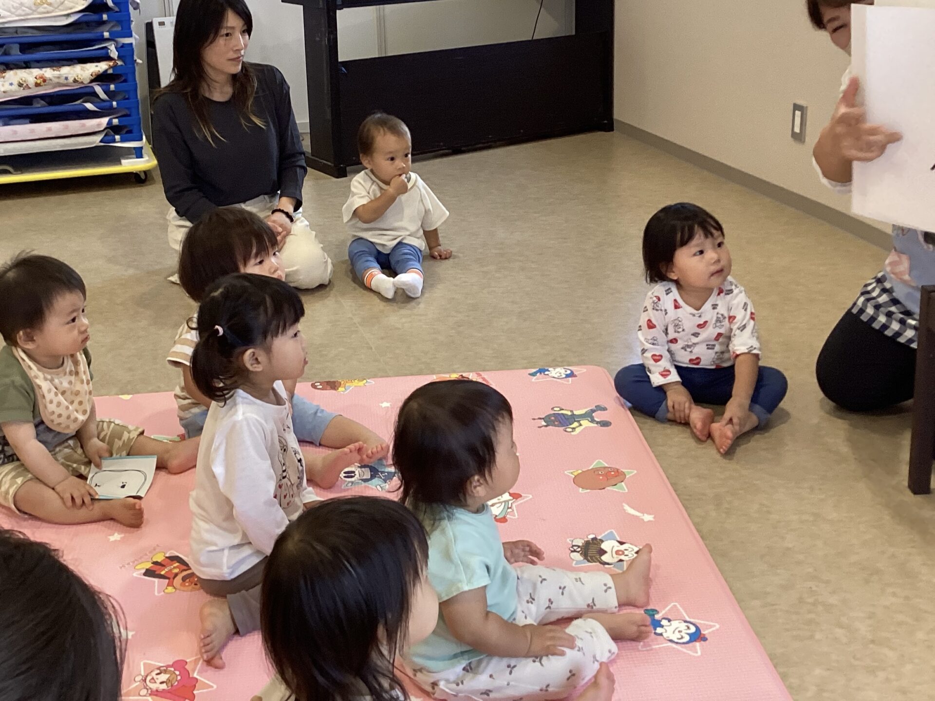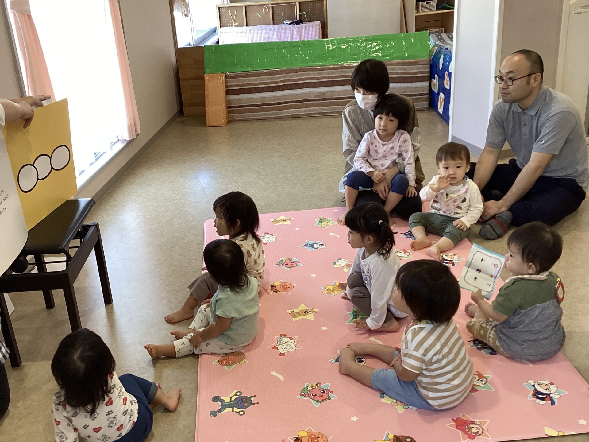 「だるまさんが」「たまごのあかちゃん」の大型絵本を見たり、「まつぼっくり」のスケッチブックシアターをお家の方と一緒に楽しみました。