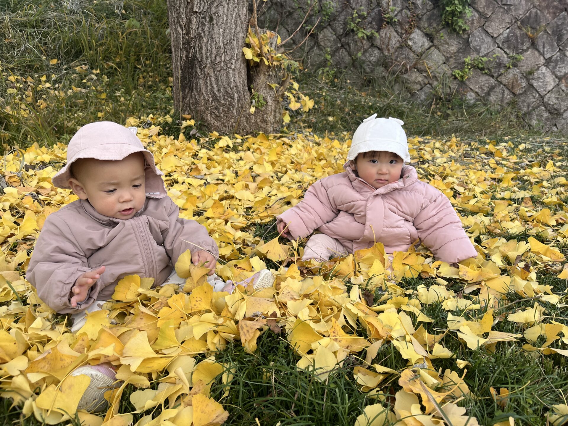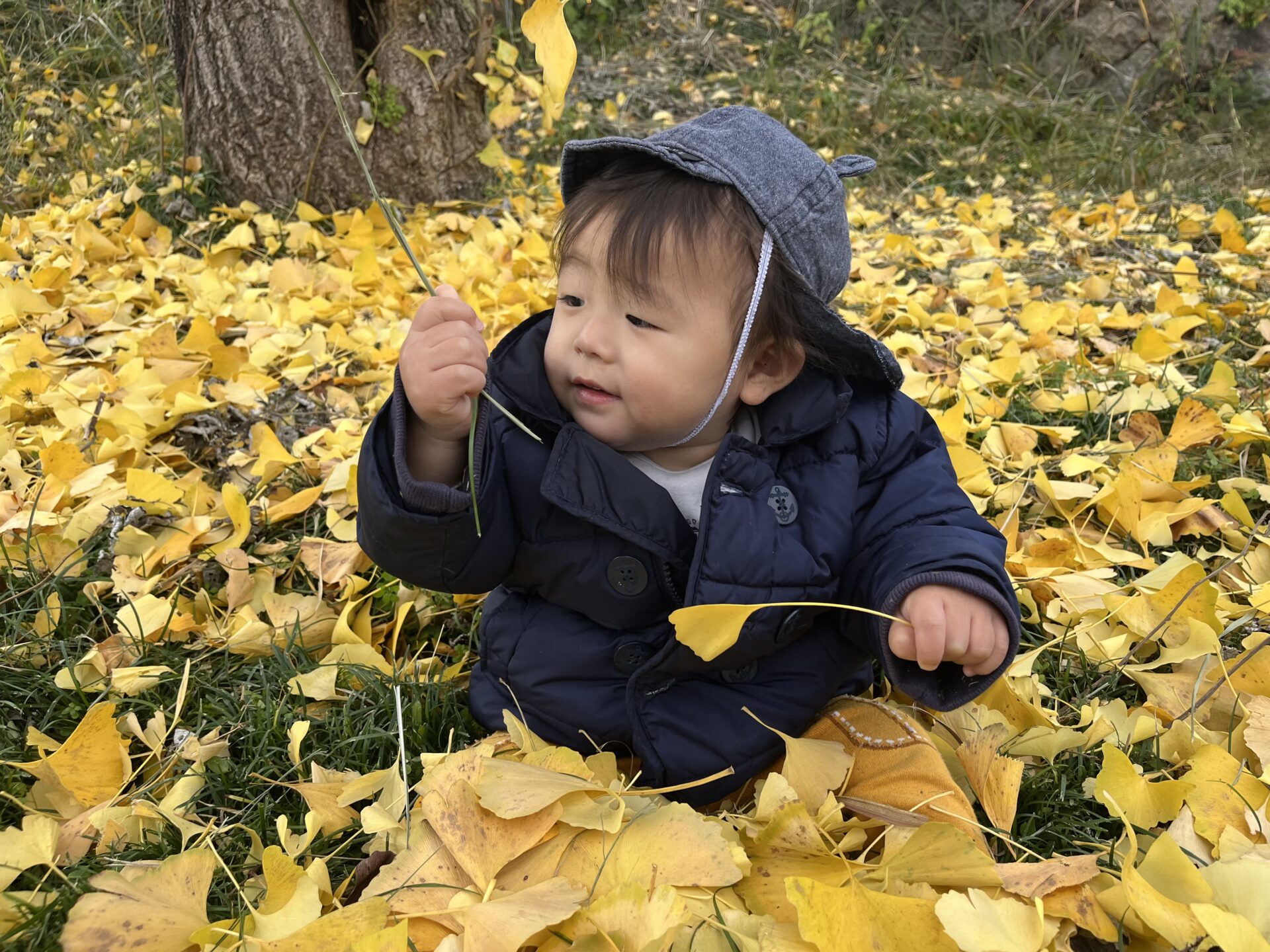 ふわふわ落ち葉のじゅうたんに座って…