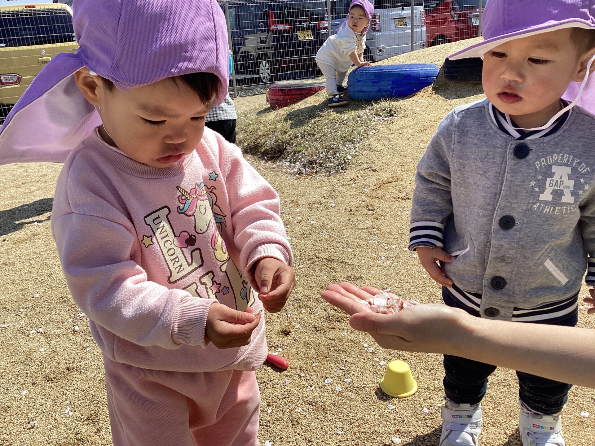 風で桜の花びらが落ちているのを保育士が見つけ、子ども達に見せてみると…… 興味津々に近付き、花びらを触ったり、ひらひらと舞う様子をじっと見つめていました!