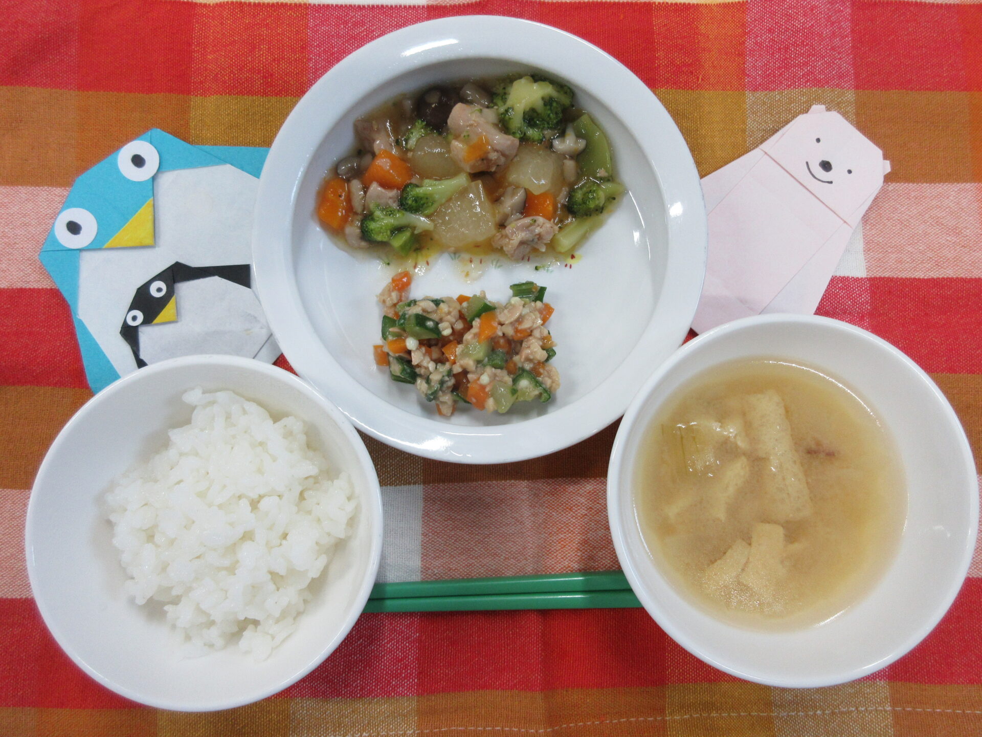 給食では、金沢市に伝わる郷土料理のひとつである治部煮を旬の”冬瓜”を使って給食風にアレンジし、お味噌汁には石川県の特産品でもあるさつま芋を使いました。