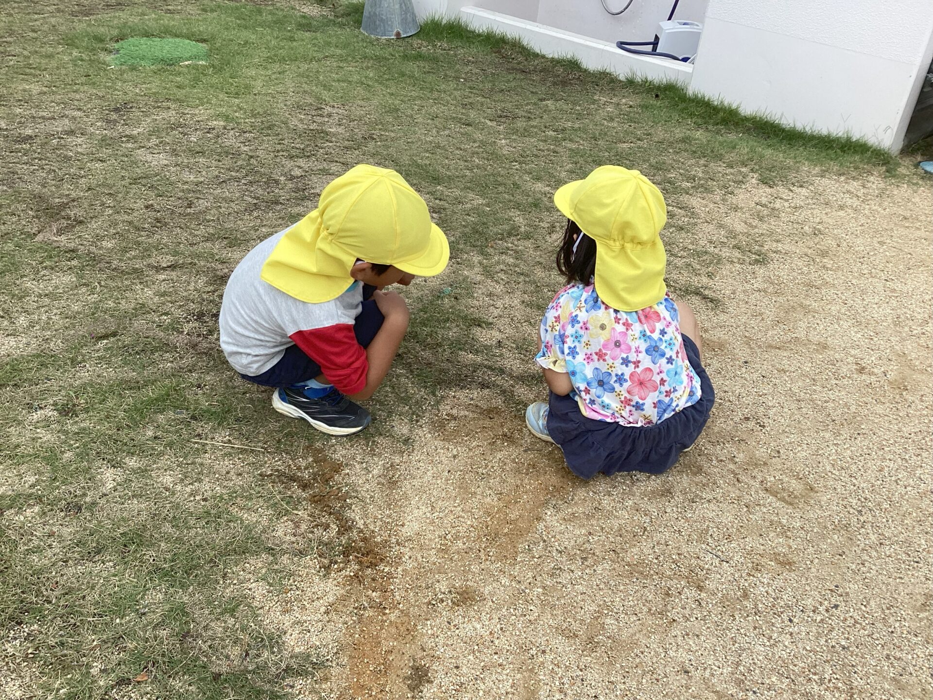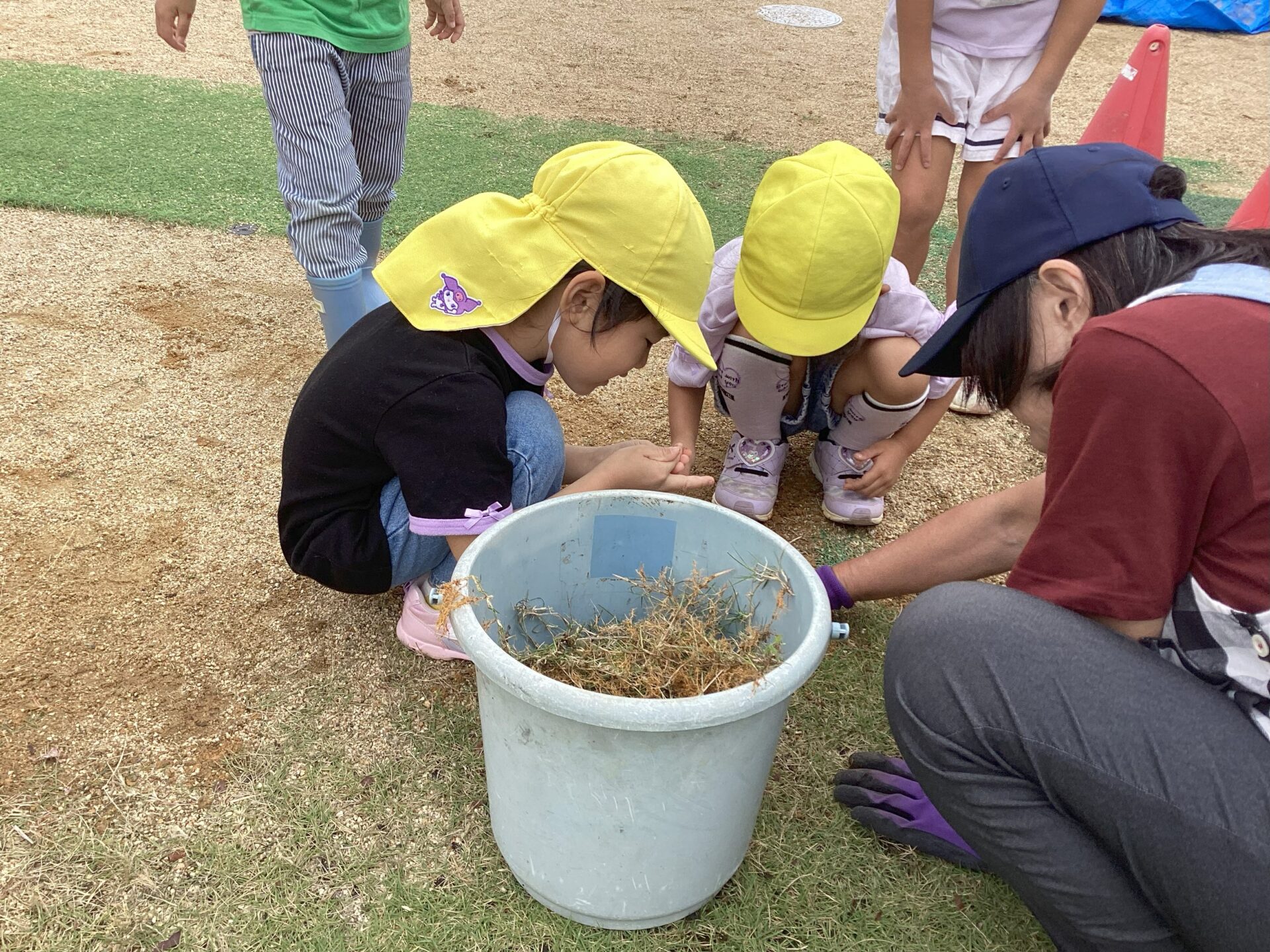 「ここにもあるよ!」「これ草かな?抜いていいの?」と話しながら、夢中にで草を探す子どもたち。